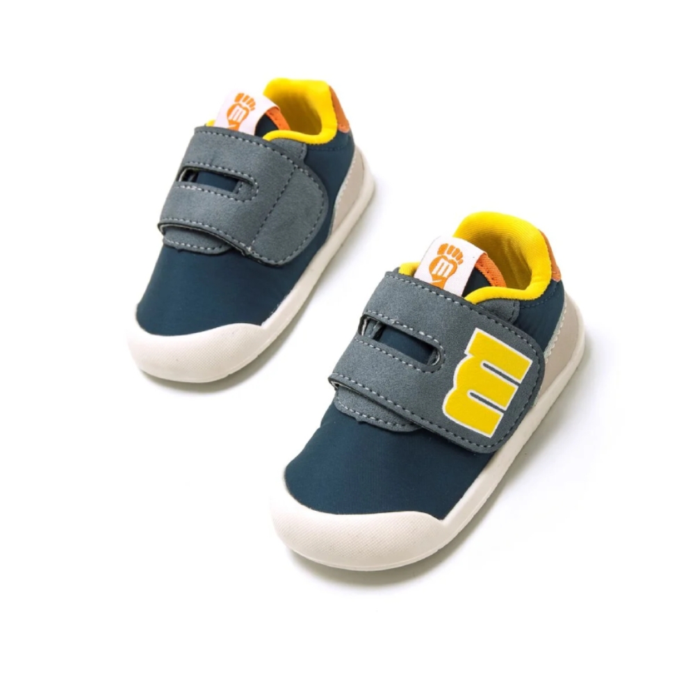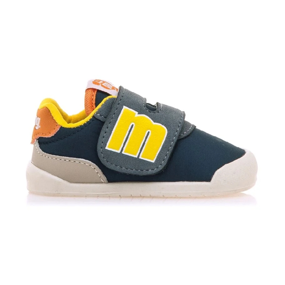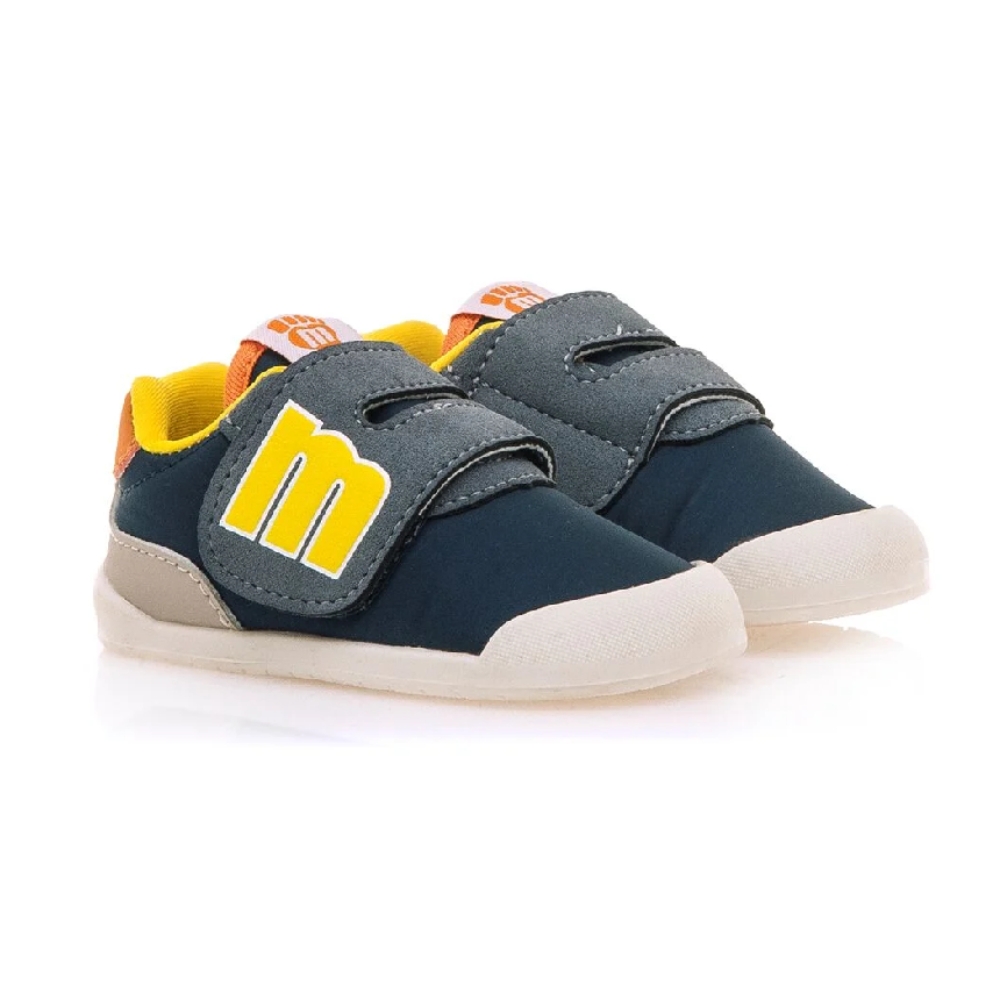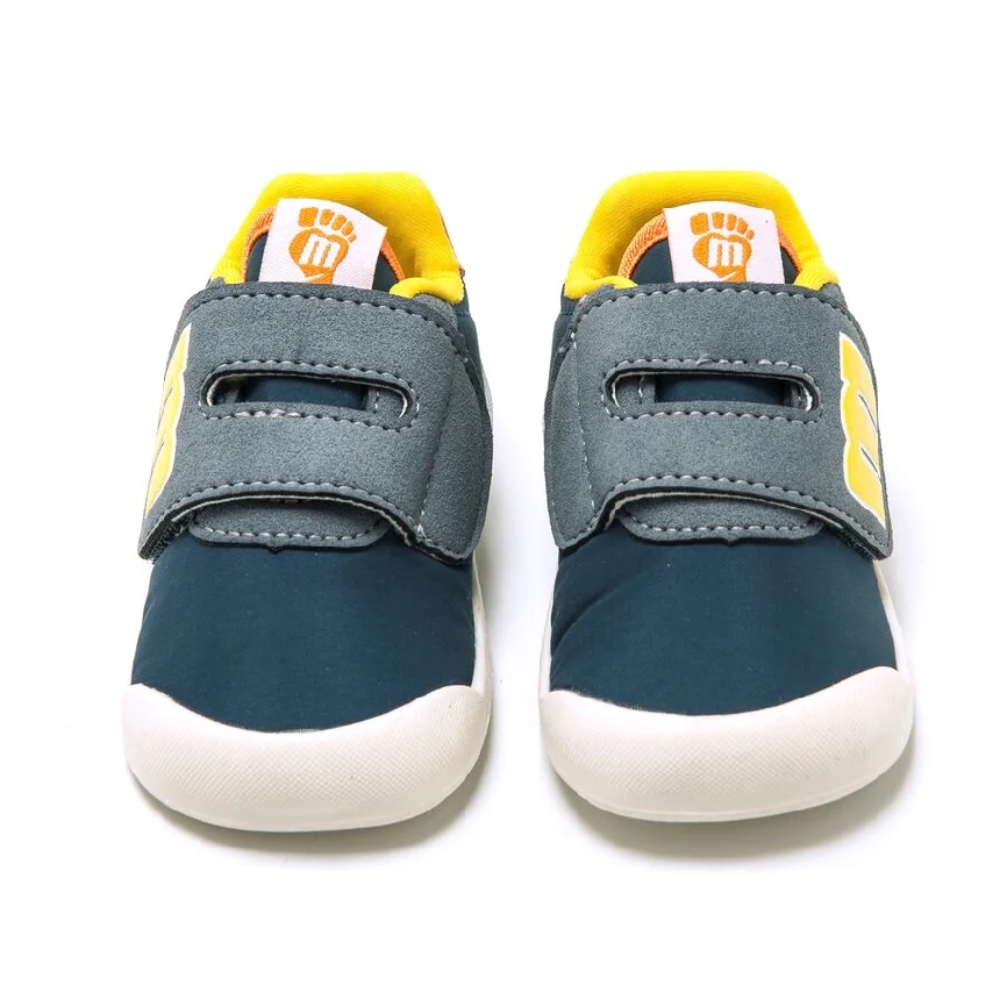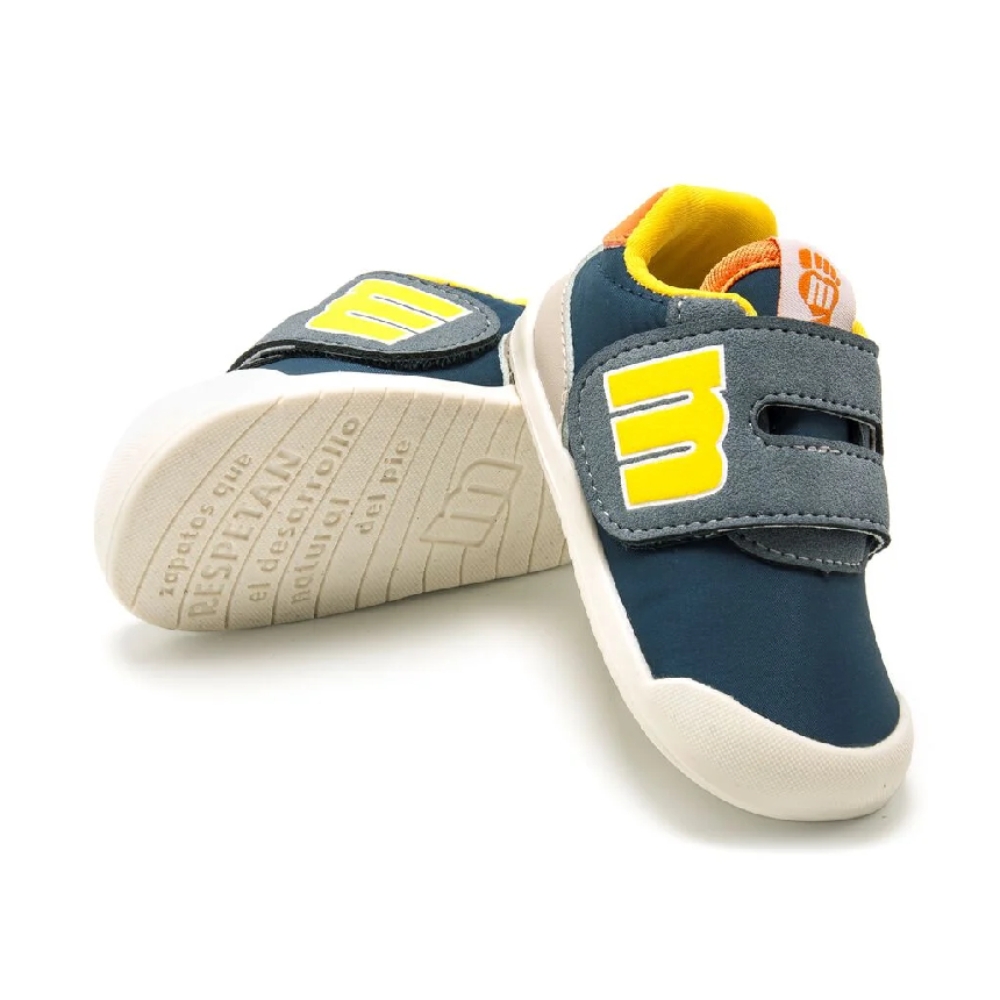 Zapatilla deportiva Free Mustang para bebés, diseñada en color azul marino, destaca gracias a su ancha tira adhesiva con el logo de la marca de color amarillo. Lengüeta y borde superior de la zapatilla de color naranja. Diseñada y desarrollada especialmente en colaboración con el Dr. Juanjo López, traumatólogo deportivo e infantil, para respetar el desarrollo natural del pie del niño y la niña. Gracias a su puntera ancha permite el libre movimiento de los dedos dentro del zapato. Su suela tiene 3 mm de grosor y con cero drop (totalmente plana) respeta el natural desarrollo del pie del pequeño y sus elementos flexibles y torsionables hace que el pie del niño no esté encorsetado por la estructura del zapato. Las plantillas extraíbles y las marcas de los dedos en la misma, facilita comprobar si la talla del calzado es la correcta para tu hijo. Además, su fácil apertura facilita que el niño pueda descalzarse y calzarse de forma autónoma. Acompaña los primeros pasos de tu bebé con Mustang.