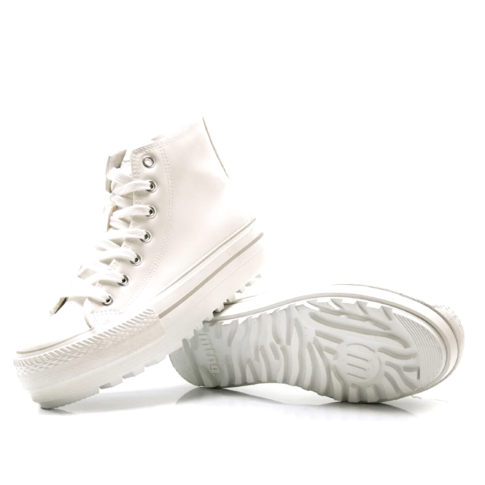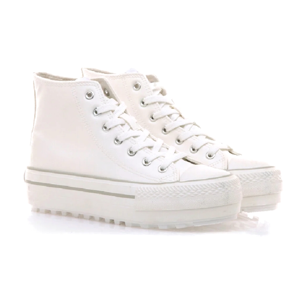 Zapatilla abotinada Bigger-T Mustang para mujer, diseñada en piel sintética de color blanco, con cierre de cordones al tono. Destaca gracias a su cómoda doble suela. Logo de la marca en la lengüeta. Suela dentada para una pisada más estabilizada. Actualizará tu estilo diario como nunca habías imaginado. Con certificado VEGANO sellado por INESCOP, el cual garantiza que la naturaleza química principal del material no se corresponde con fibras de origen animal