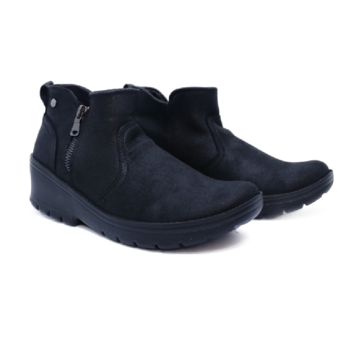 Estos botines negros son ideales para el día a día, combinando estilo y comodidad en un diseño moderno y versátil. Fabricados en material textil con acabado suave, presentan un diseño elegante con una práctica cremallera lateral que facilita el calce y ajuste. La cuña de altura media proporciona una elevación cómoda, perfecta para añadir altura sin sacrificar el confort.