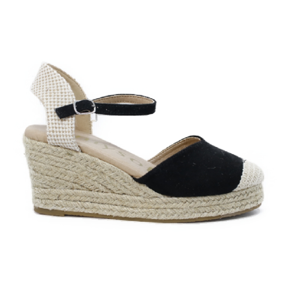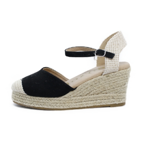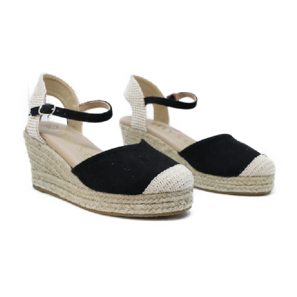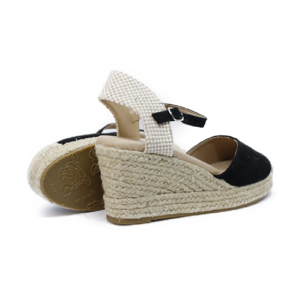 Sandalia valenciana de la marca MYSOFT para mujer, realizada en material textil y pulsera de piel con hebilla ajustable que facilita su calce y ajuste al pie. Planta de piel acolchada de gran comodidad y suavidad en la pisada. Cuña de esparto y suela de goma para mayor agarre. Medidas: cuña 7 cm