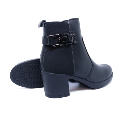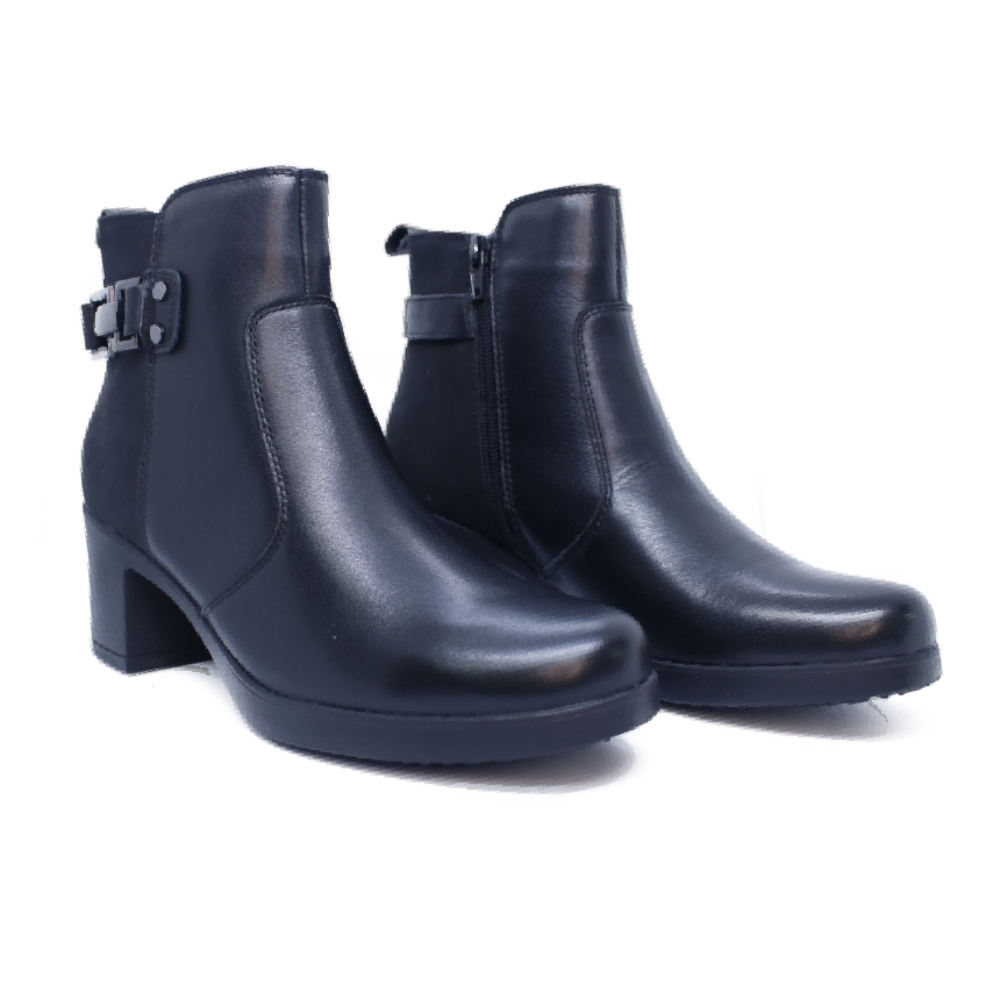 Botín de tacón en color negro, fabricado en piel. Forro téxtil y plantilla memory foam extraíble. Cierre de cremallera lateral. Suela flexible antideslizante. Cómodo tacón ancho de 6 cm de altura.