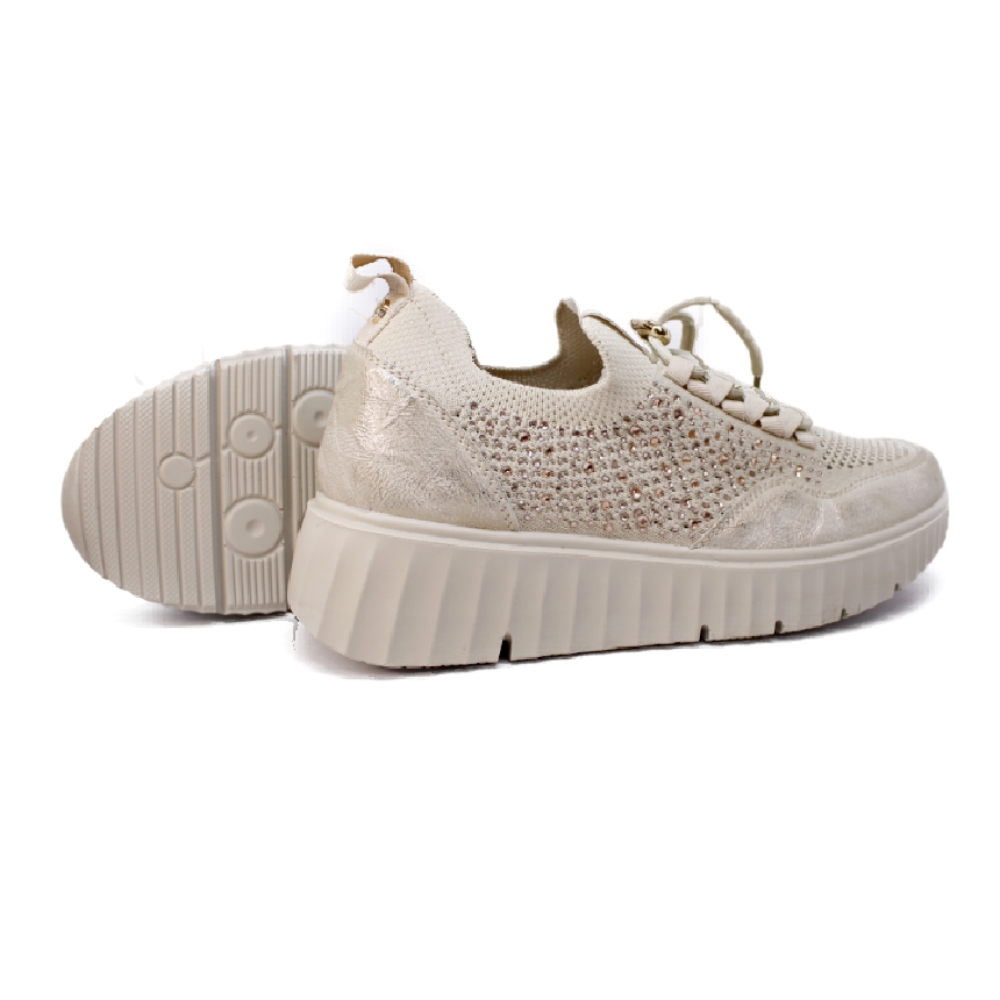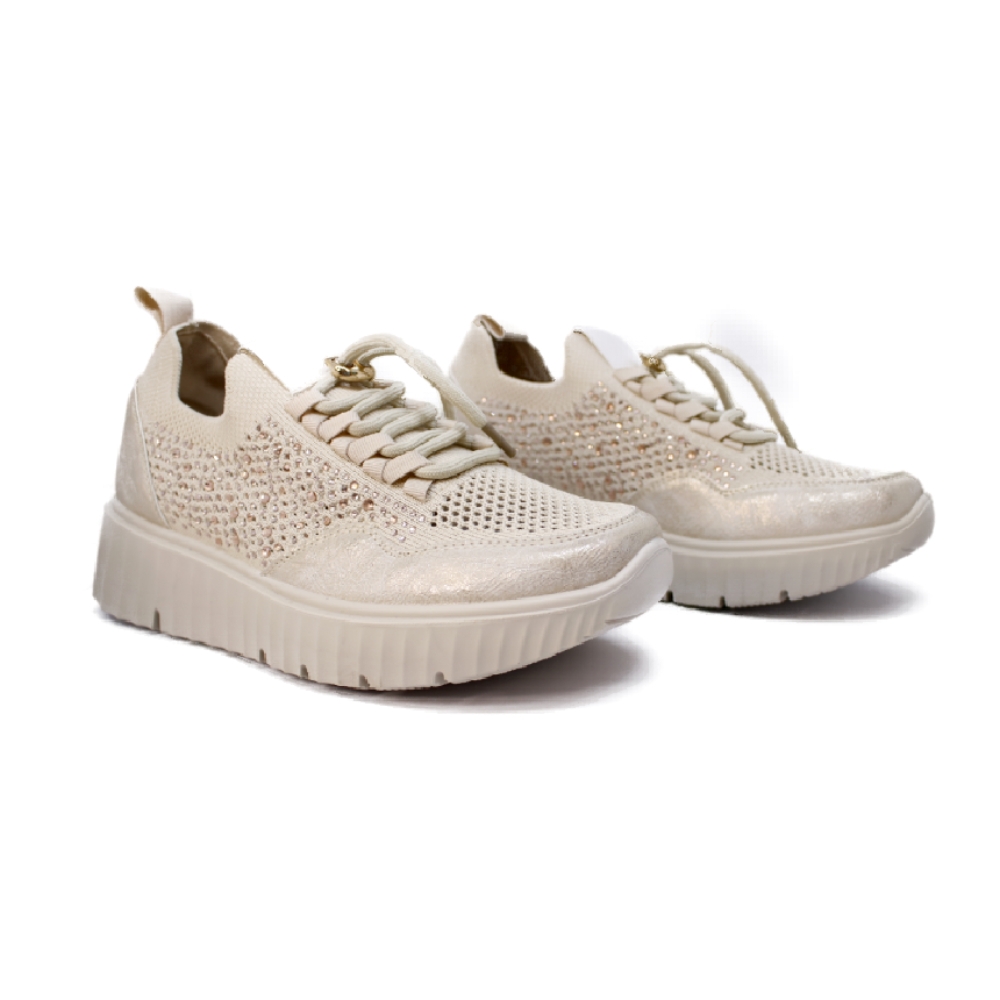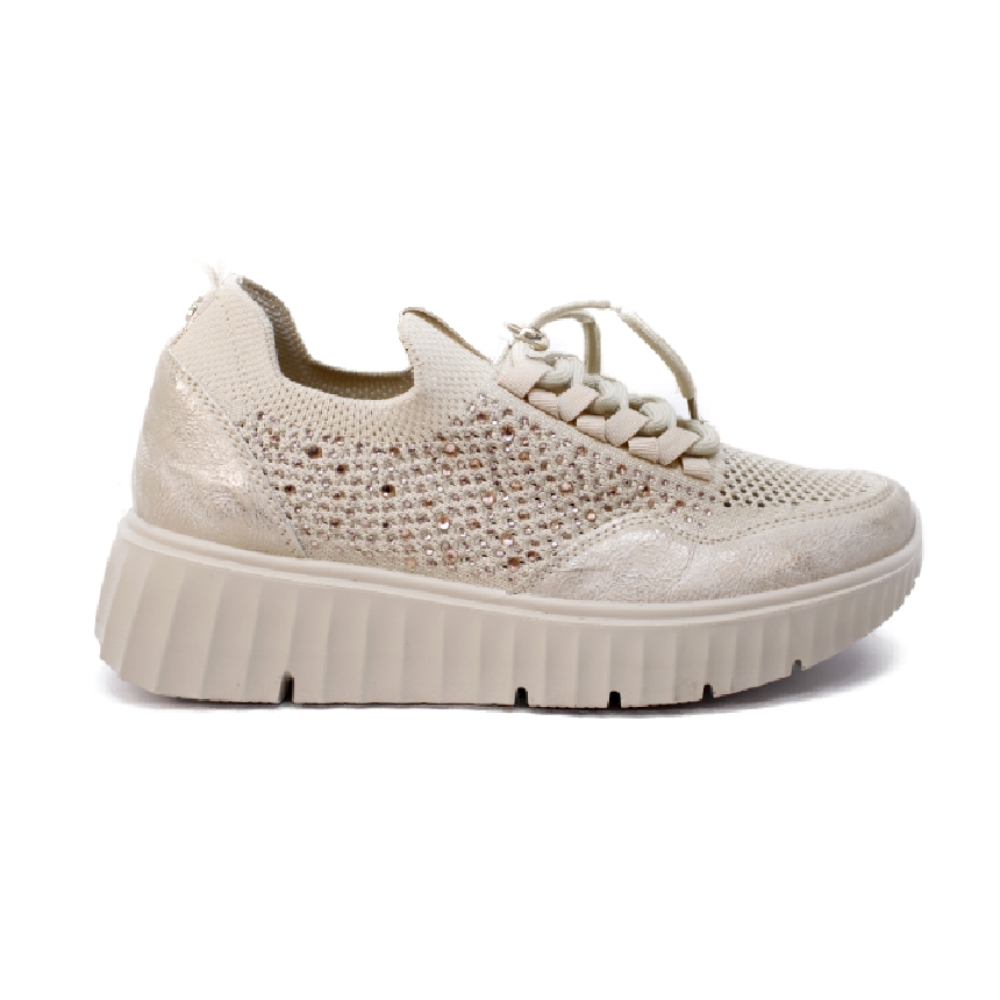 Zapatilla deportiva para mujer, fabricada en microfibra elástica  en color platino con detalle en dorado. Interior textil. Cierre con elásticos al tono con los que podrás calzarte facilmente y olvidarte de atar cordones. Plantilla de piel extraíble. Detalle de tirador trasero. Suela de goma extra light de 3,8 cm.con plataforma de 2 cm. Un deportivo perfecto para llevar en tu día a día. Incorpora una segunda cordoneria dorada.