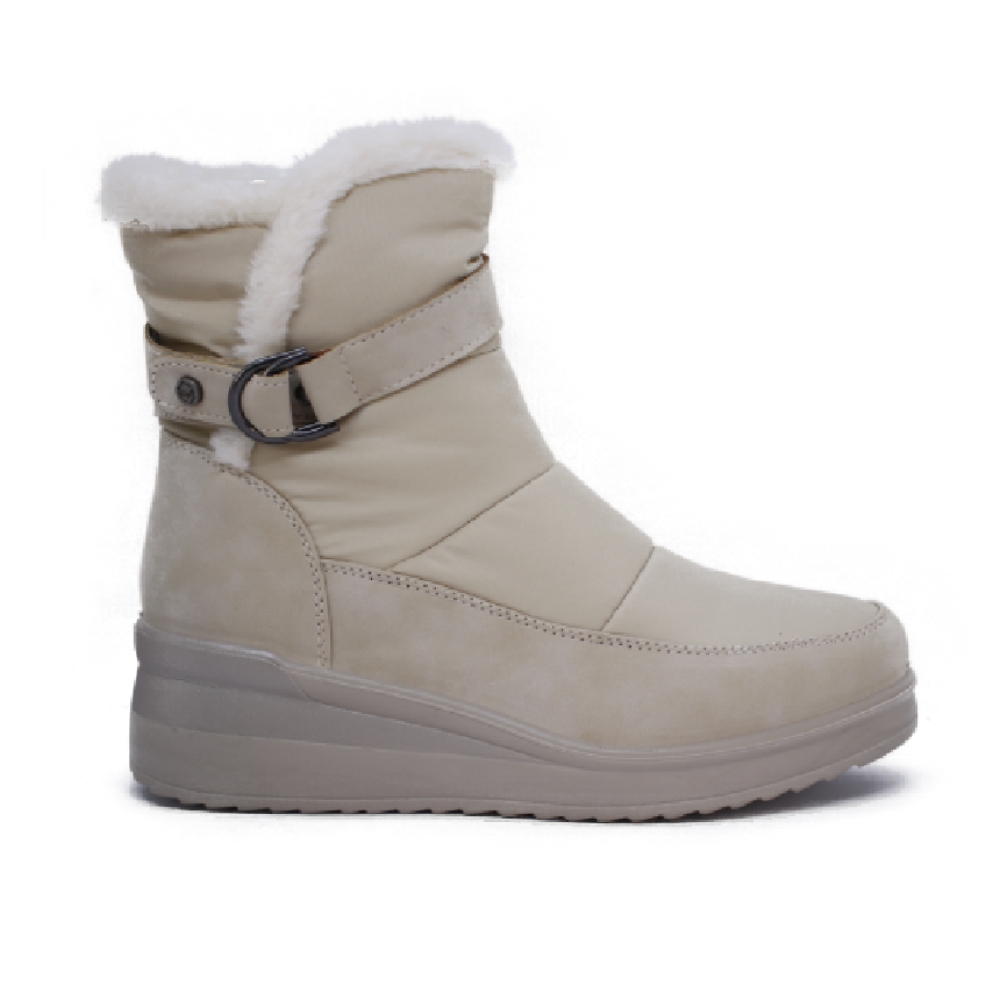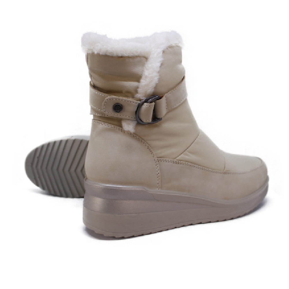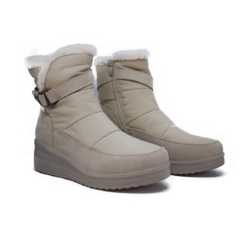 Presentan un diseño funcional para el frío, con un cierre o ajuste lateral que incluye una hebilla metálica. La suela es robusta y de un color más oscuro que el cuerpo de la bota, sugiriendo buen agarre. La caña cubre el tobillo y parte de la pantorrilla.