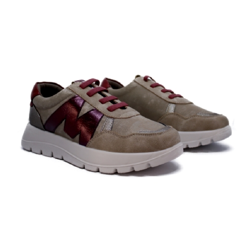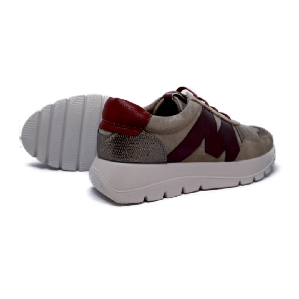 Zapatilla de estilo casual o deportivo, con una suela gruesa y una parte superior que combina diferentes texturas y colores.  Predominan los tonos neutros como el beige o crema en la mayor parte de la zapatilla, con detalles en marrón oscuro o burdeos, formando un patrón distintivo en forma de "M" en los laterales, y una sección en gris o topo en la parte trasera. Confeccionada en tejido transpirable y piel sintética.