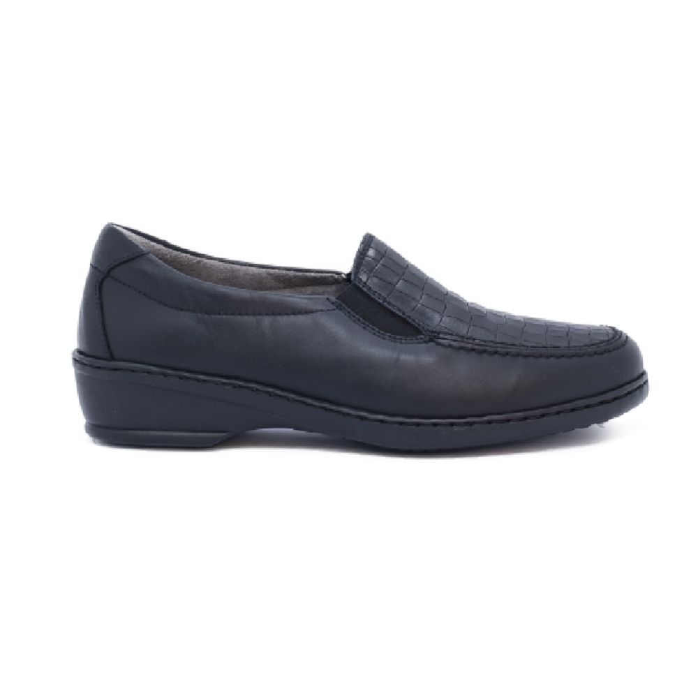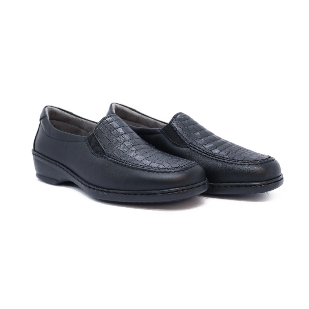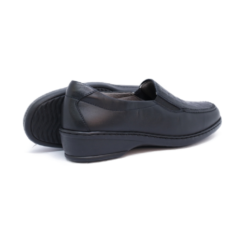 Zapato de copete Notton en color negro para mujer. Fabricado pensando en los pies más exigentes y complicados, cuenta con horma de ancho especial y plantilla extraíble además de suela de goma SuperFlex que añade un extra de flexibilidad y adherencia.