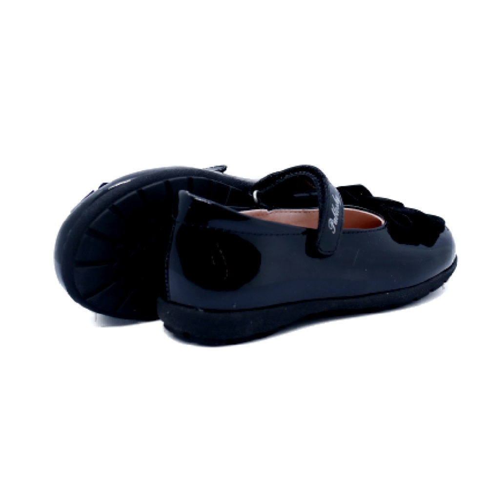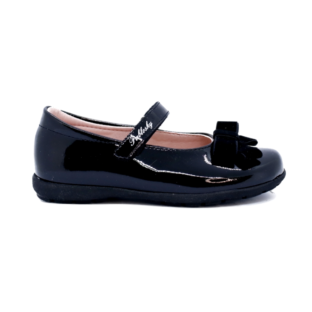 Zapato niña de vestir realizado en piel charol de color negro. Un diseño clásico y elegante con un pequeño lazo de terciopelo. Camina hacia un futuro más sostenible con la exclusiva tecnología Pablosky green System: