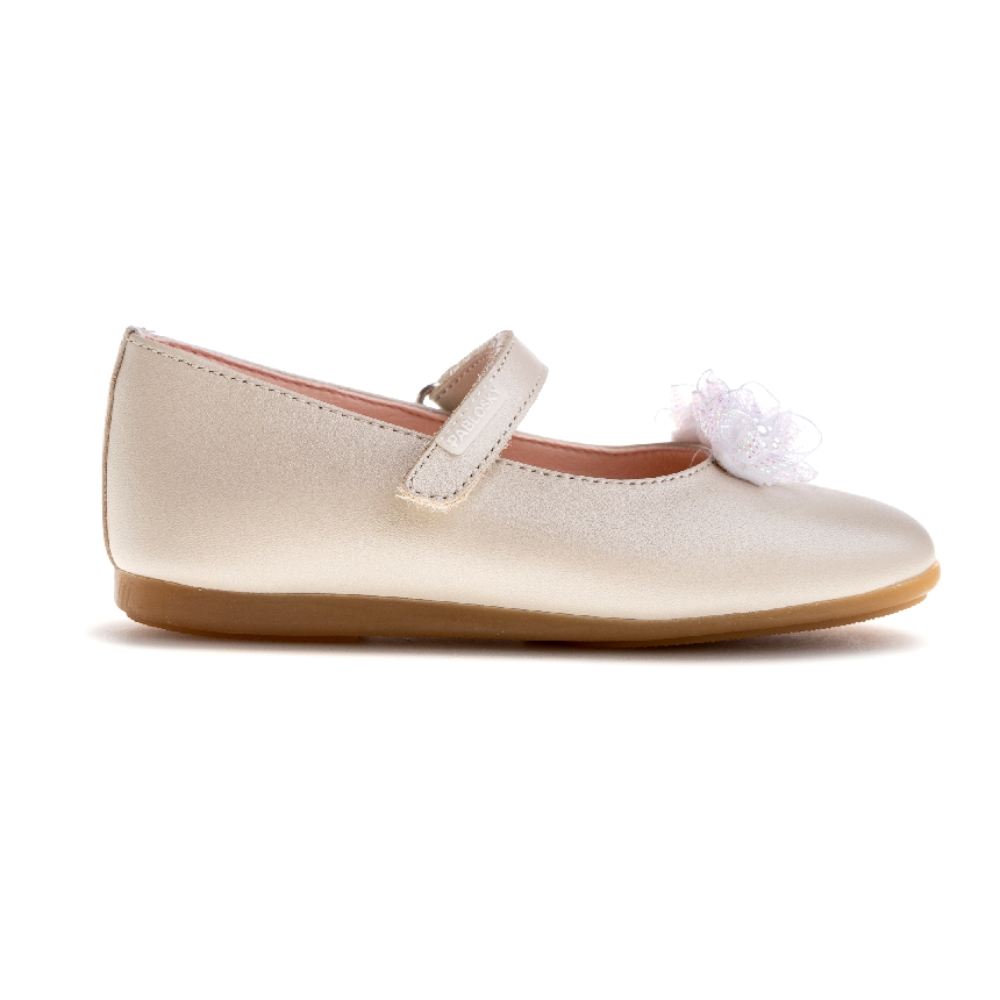 Fabricado en piel de alta calidad, destaca por su diseño elegante con flores de tul que aportan un toque delicado y sofisticado. Incluye una cómoda tira ajustable para un mejor ajuste al pie, ofreciendo seguridad y comodidad durante todo el día. Su suela flexible y ligera garantiza libertad de movimiento, mientras que el interior en piel proporciona suavidad y transpirabilidad. Perfecto para completar cualquier look formal con estilo y confort.