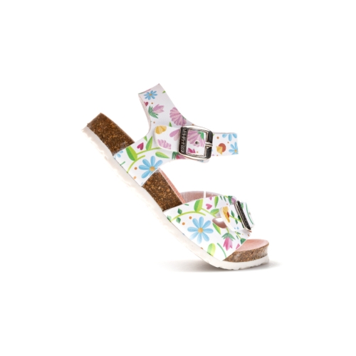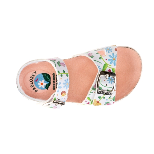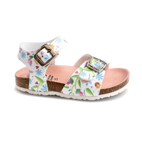 Sandalia bio de Pablosky  en color blanco con flores estampadas para niña. Un modelo muy confortable y divertido para las aventuras de tu peque este verano. Fabricadas en materiales de primera calidad para asegurar una correcta transpiración y avalados por expertos podólogos.