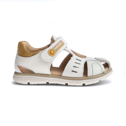 Sandalia blanca de niño realizada con  Pieles naturales que garantizan la correcta transpiración del pie.