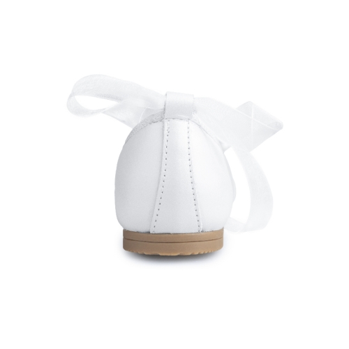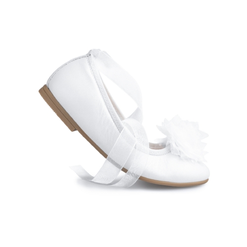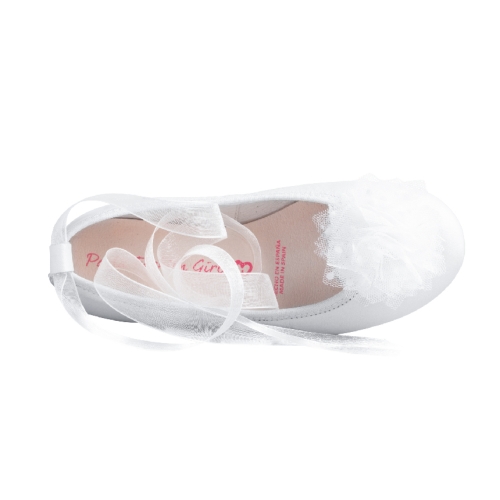 Zapato de ceremonia niña tipo bailarina. Se ajusta mediante una cinta de organza.  Cuenta con la garantía de calidad de Pablosky, que incorpora: Pieles naturales que garantizan la correcta transpiración del pie y cuentan con el certificado ambiental LWG Forro inTech sin costuras, una microfibra ecológica 7 veces más absorbente que la piel, neutro y resistente. Cuenta con el certificado STANDARD 100 by OEKO-TEX® Plantilla amortiguadora superabsorbente y antibacterias Piso de goma flexible, antideslizante y resistente al desgarro. El detalle elástico ayuda a mejorar la sujeción del pie. Zapato orgullosamente diseñado y fabricado en España.