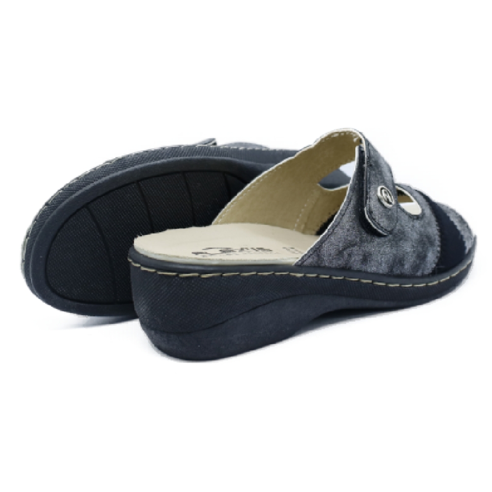 Sandalia destalonada mujer cuña baja. Se compone de dos tiras, una de ellas con tira adhesiva para mejor ajuste. Plantilla realizada en piel y exterior en suave material vegano. Ideal para ir cómoda sin que nada apriete tus pies.