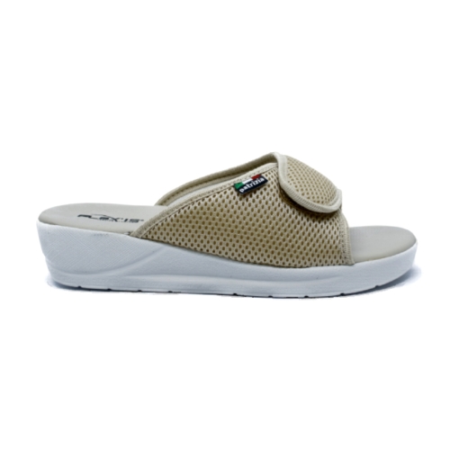 Zueco destalonado mujer ancho especial. Se adapta perfectamente a pies anchos gracias a su tejifo elástico y al cierre de velcro. Planta de piel acolchada. Cuña antideslizantes de 4 cm.
