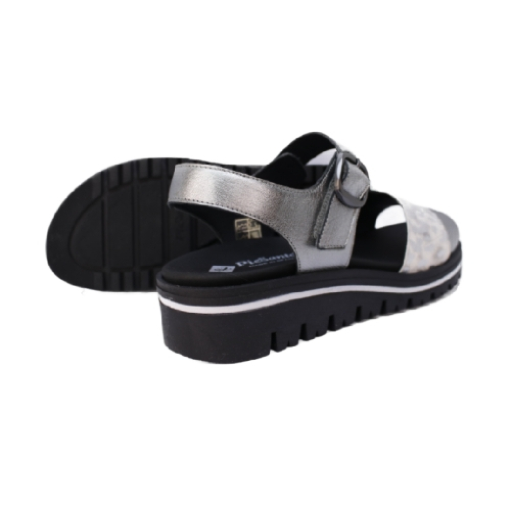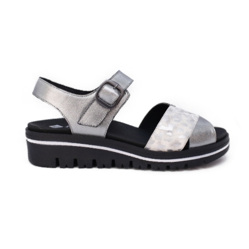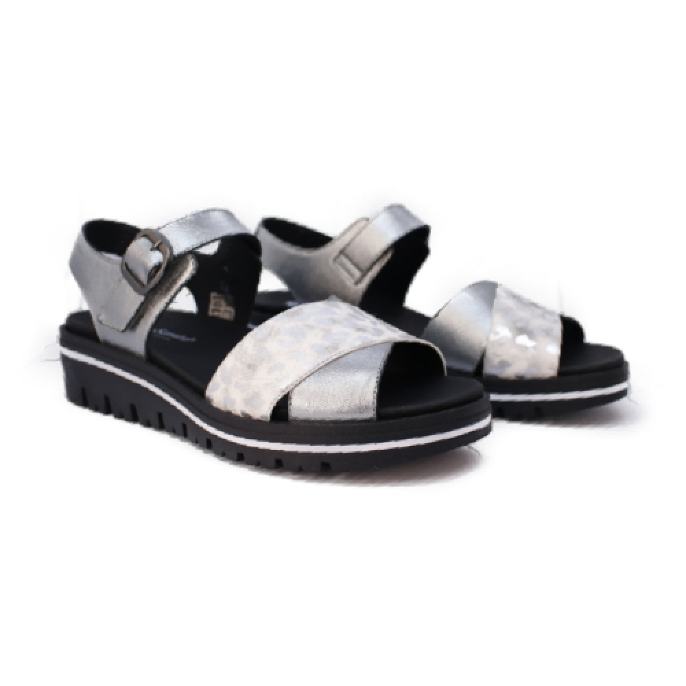 Sandalia cuña de mujer con diseño animal print en negro y plateado, perfecta para pies anchos y delicados. Fabricada en España con materiales de primera calidad, ofrece sujeción y comodidad. La plantilla extraíble y acolchada proporciona soporte adicional. Un diseño moderno y funcional que destaca por su estilo y confort.