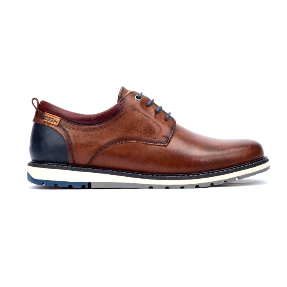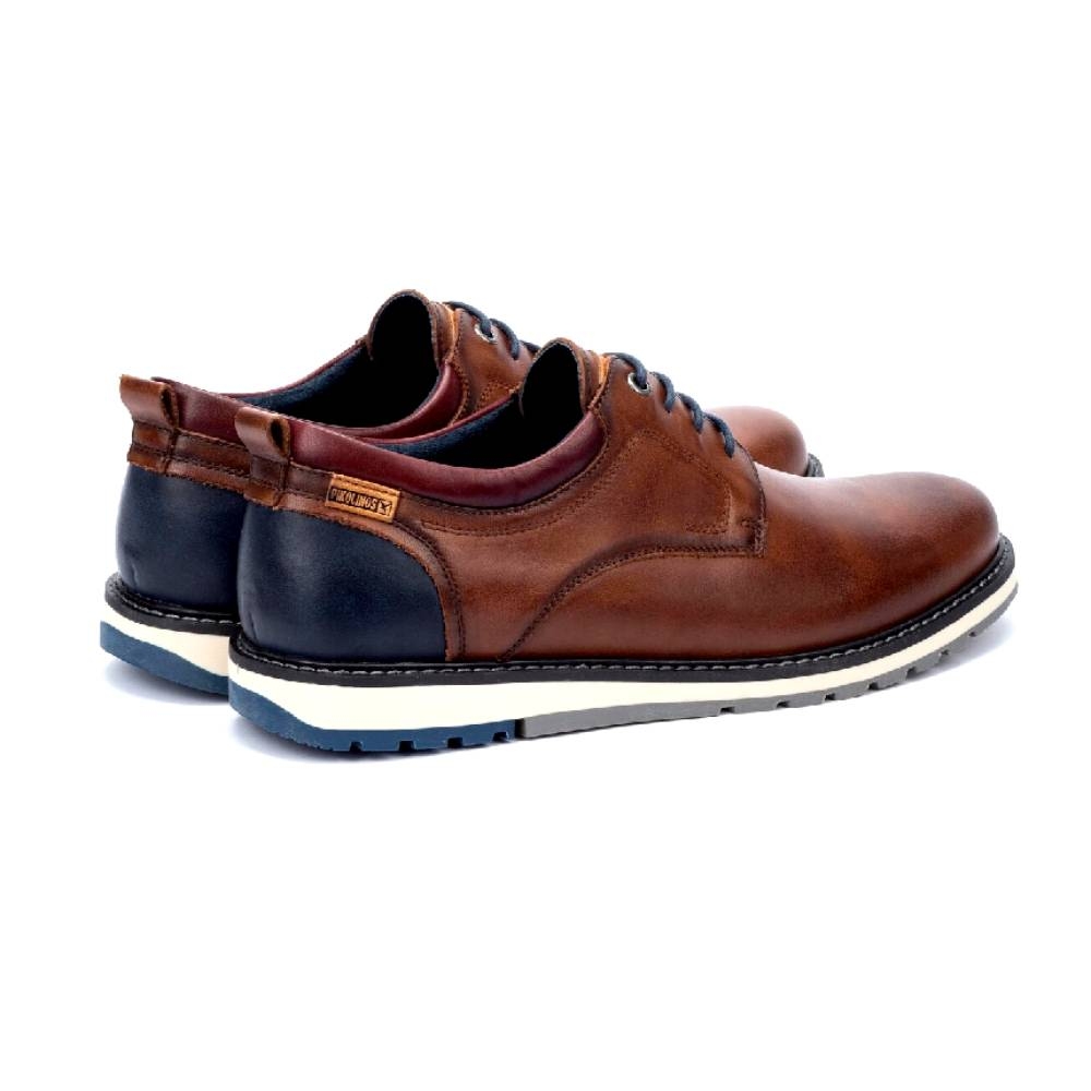 Este modelo de Pikolinos combina tradición artesanal y diseño actual en un zapato de cordones para hombre, fabricado en piel de primera calidad en tono cuero. El detalle en color marino en el talón aporta un contraste moderno y elegante, realzando su estilo versátil.