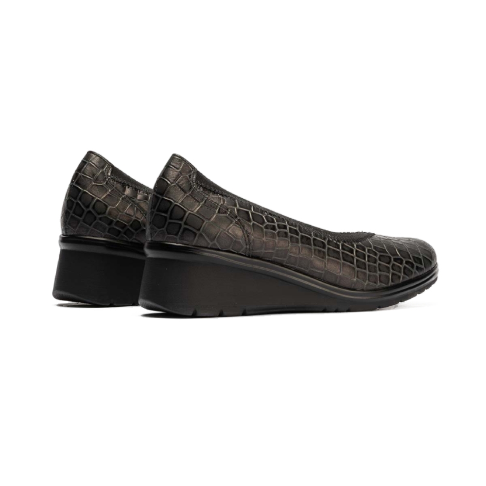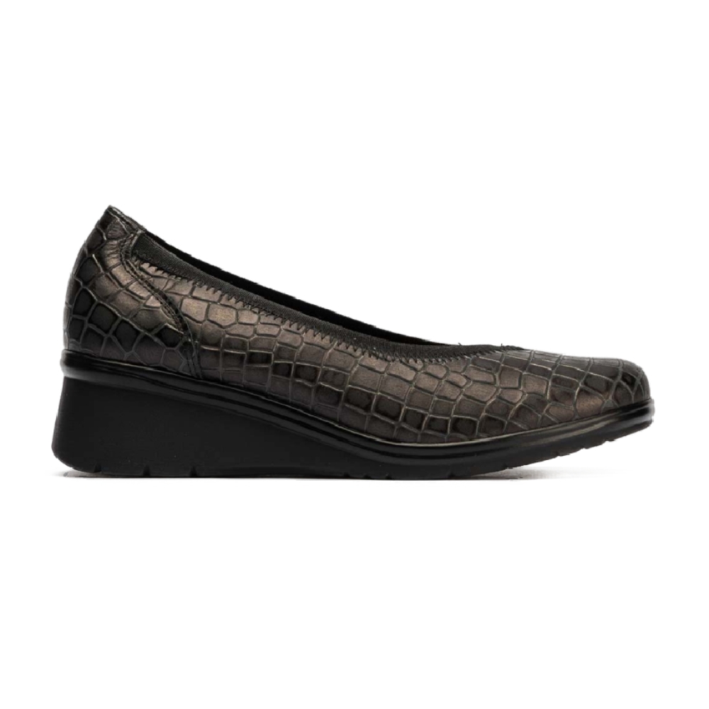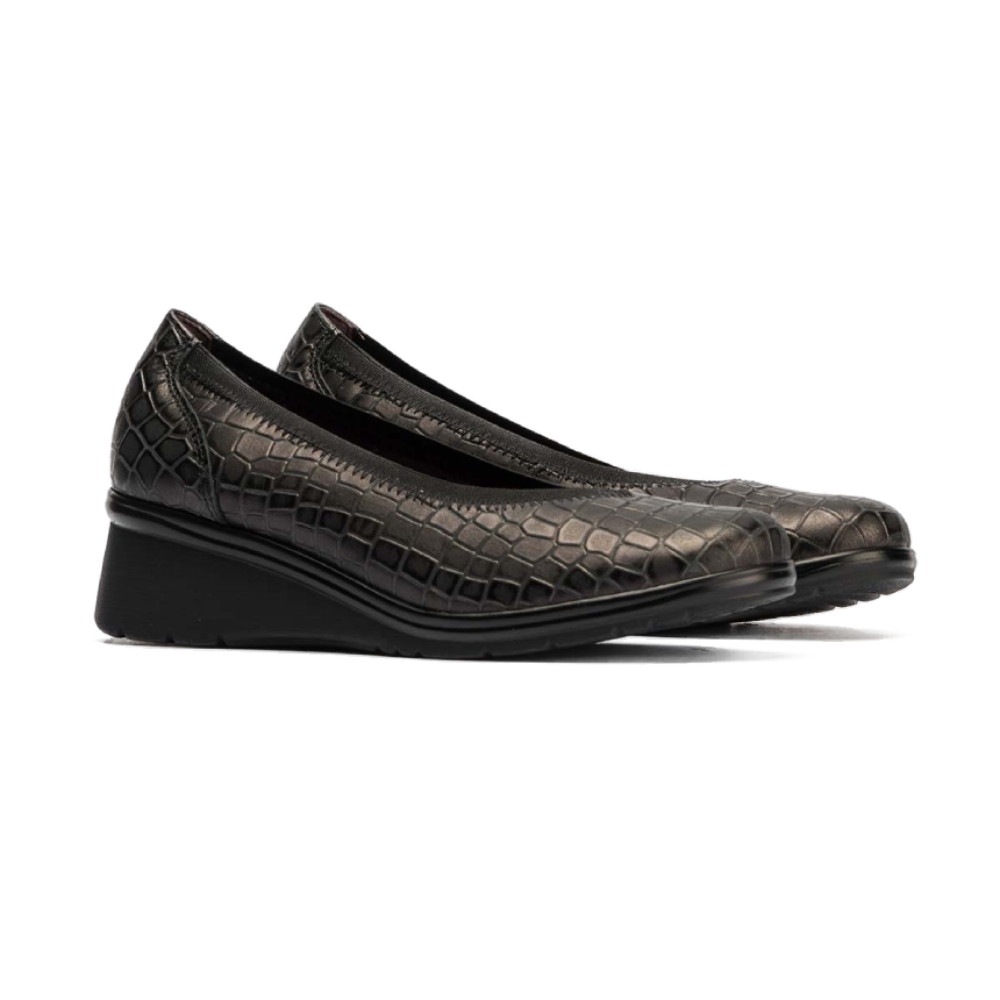 Salón con cuña muy cómoda de la marca Pitillos. Fabricado en piel de vacuno con efecto brillo, detalles en casi todo el corte metálicos. Modelo mas ancho. Suela tipo cuña media con plataforma para que nos resulte mas cómoda la pisada. Detalle de ribete pintado oro en el filo del zapato. Ajuste mediante ribete elástico en el contorno del corte, favoreciendo el ajuste. Plantilla acolchada extraíble. Calce de talla habitual y se adapta a juanetes.