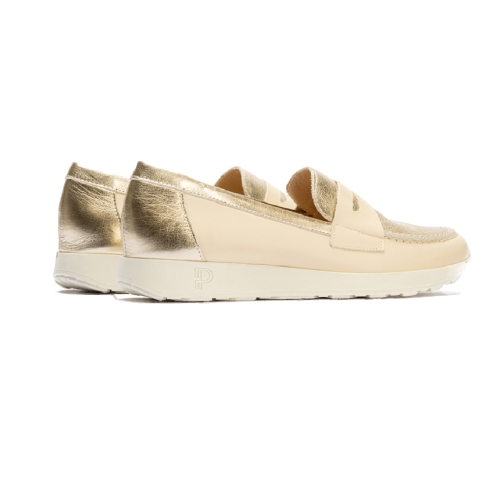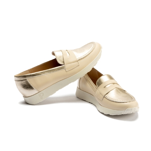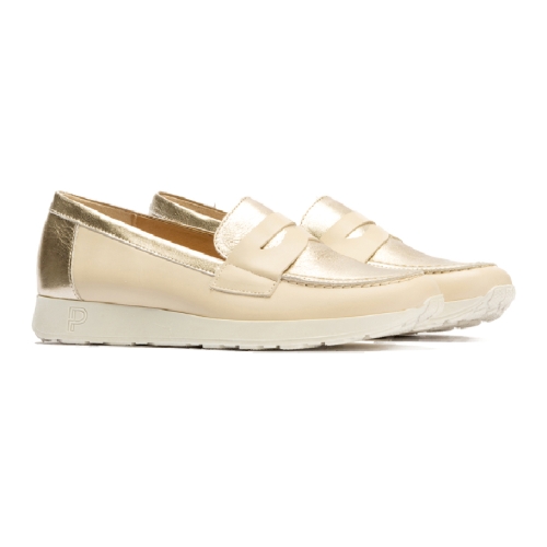 Mocasín de la marca Pitillos, fabricado en España con materiales de primera calidad. De piel con brillo, dos combinaciones: crema y dorado.