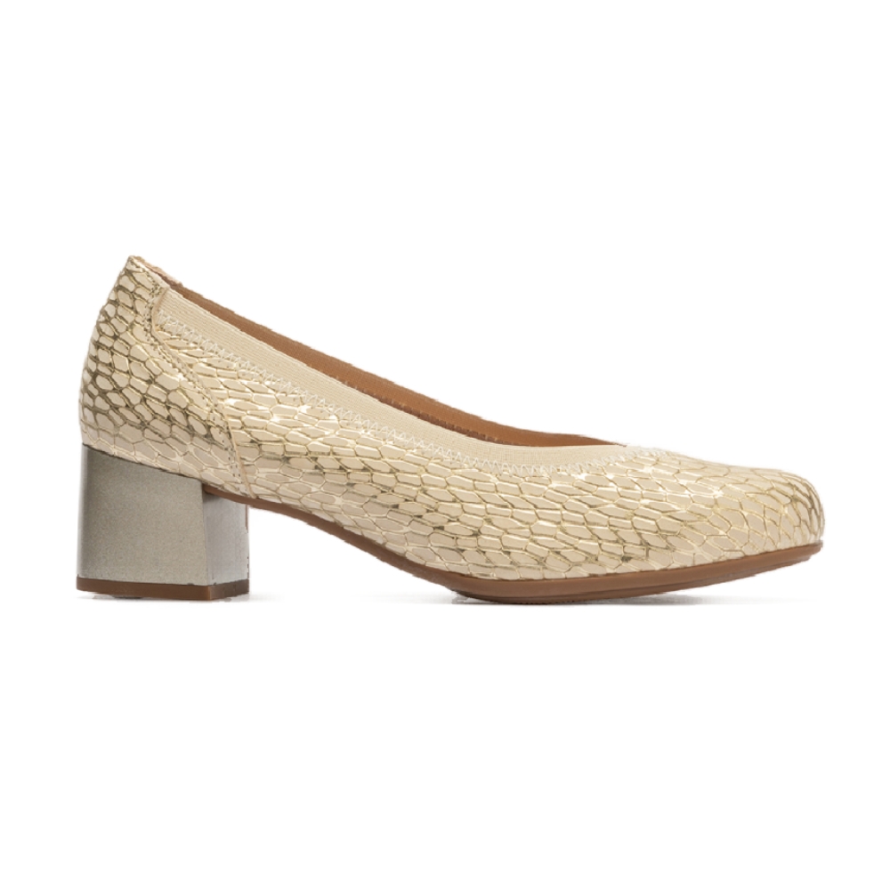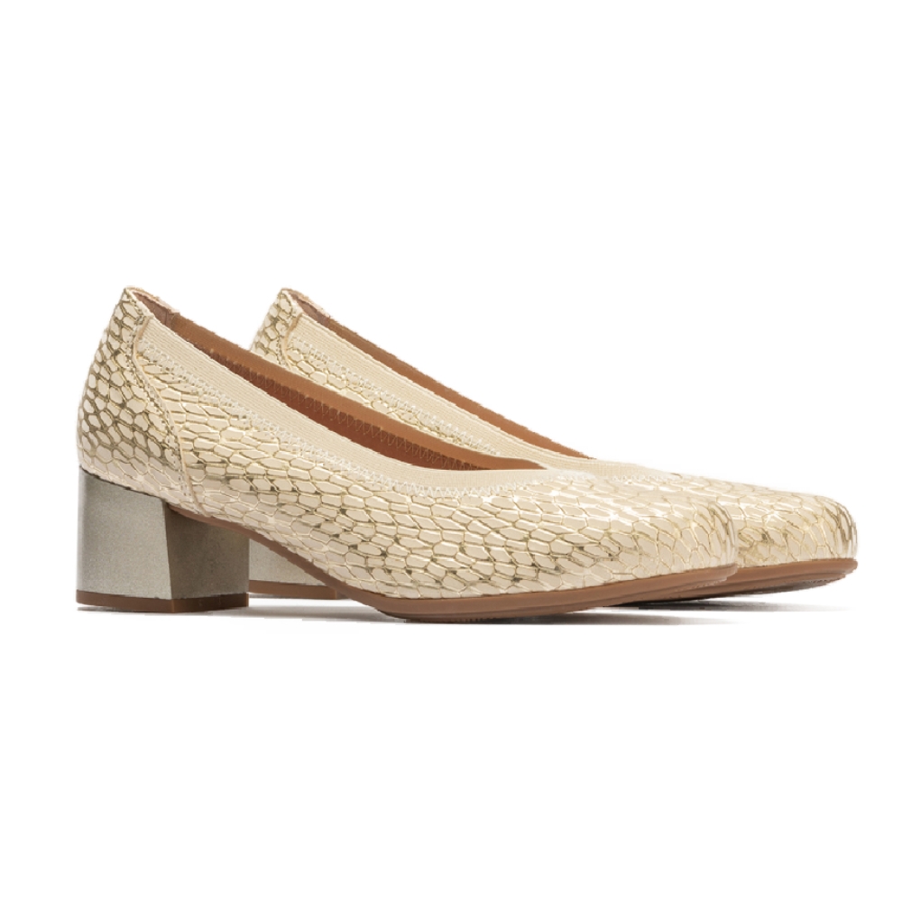 Zapato de salón escotado para mujer, de la marca Pitillos en color dorado. Fabricado con materiales de piel de primera calidad, repleto de brillos para dar vida a todos tus outfits. Ribete de goma elástica, para adaptarse perfectamente a la anatomía del pie, ofreciendo un buen ajuste y facilitando el calce. Puntera redondeada. Plantilla acolchada color cuero, de gran comodidad, con nombre de la marca grabado. Suela de goma antideslizante, con tacón ancho de apróx. 4,5cm de altura.
