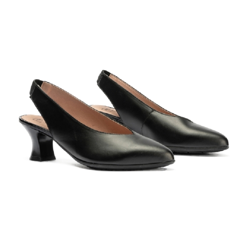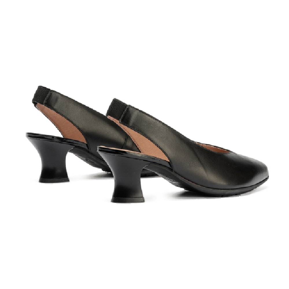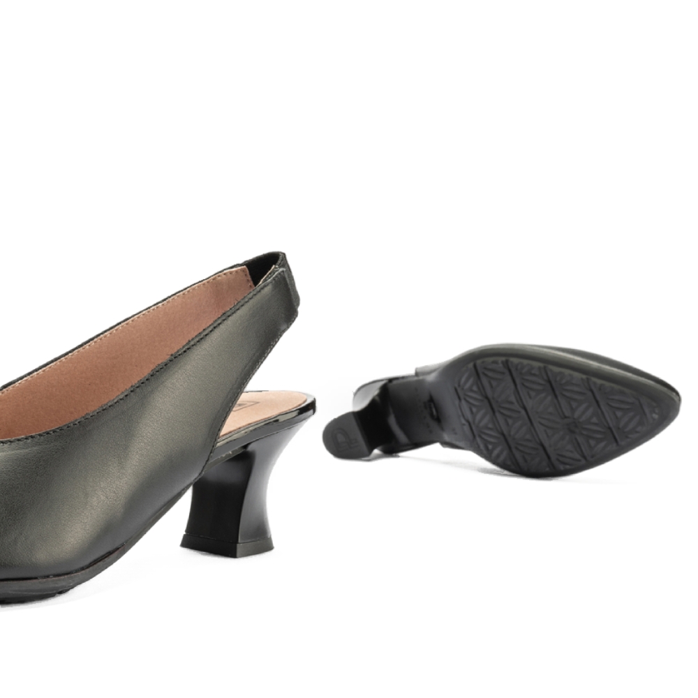Zapatos de salón de mujer destalonado en piel y tacón embudo NEGRO: Estos zapatos de salón destalonados en piel negra con tacón embudo te brindarán un look sofisticado y versátil para cualquier ocasión.