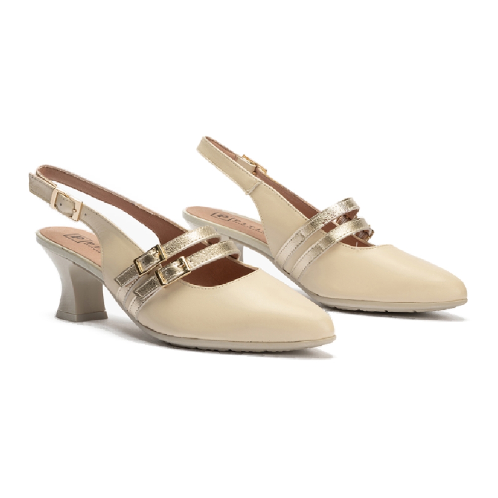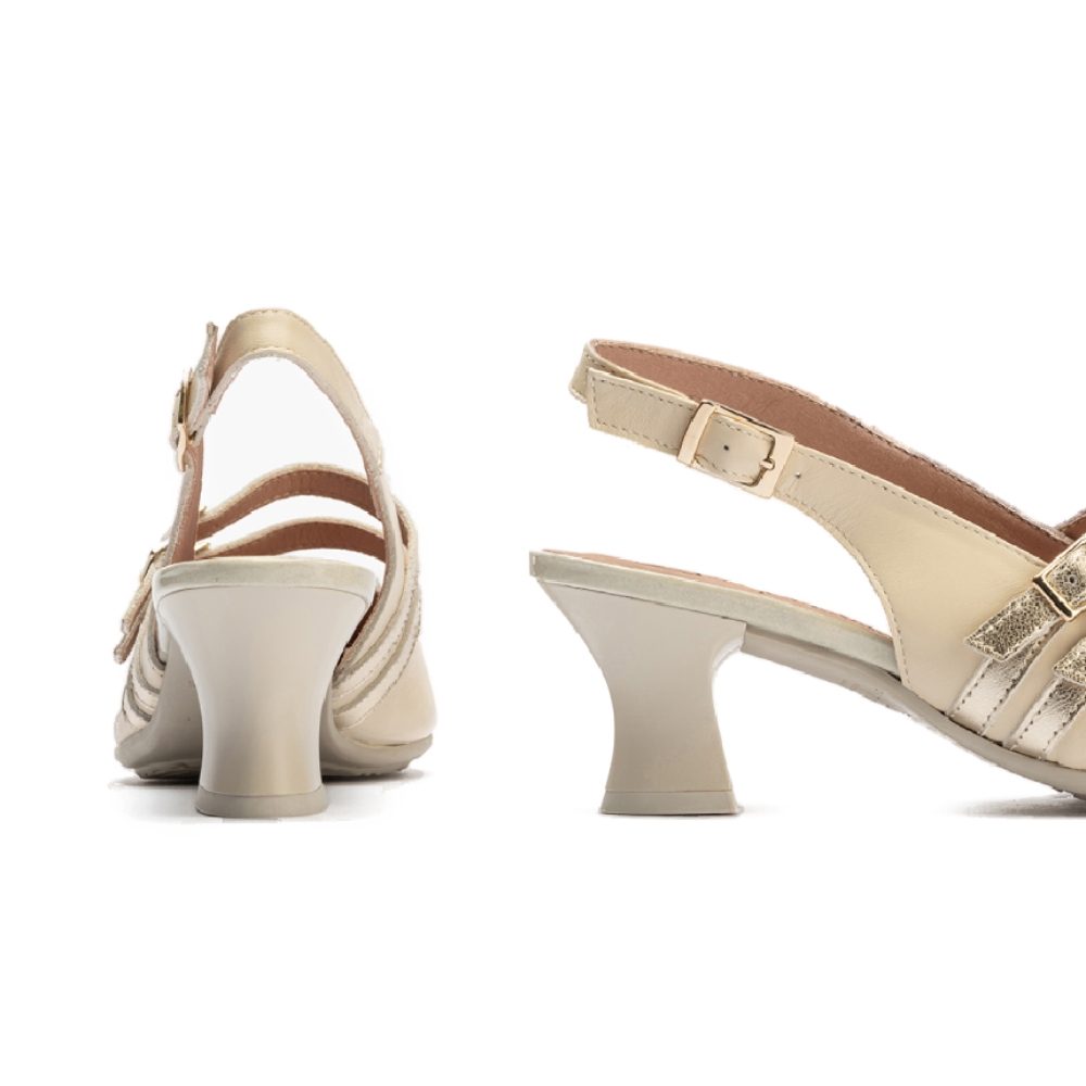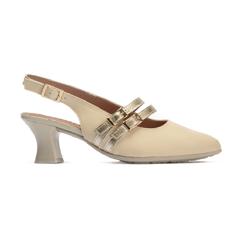 Zapato destalonado de salón, clásico, de mujer con tacón medio con base ancha, 6.5cm, cierre con hebilla doble al tobillo, Hecho en España con piel color beige y detalles dorados. Punta fina sin plataforma. Dedos cubiertos.