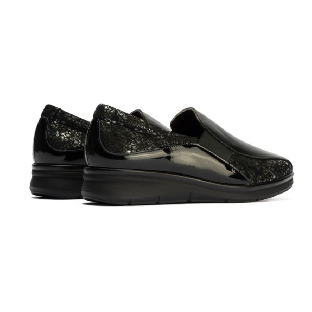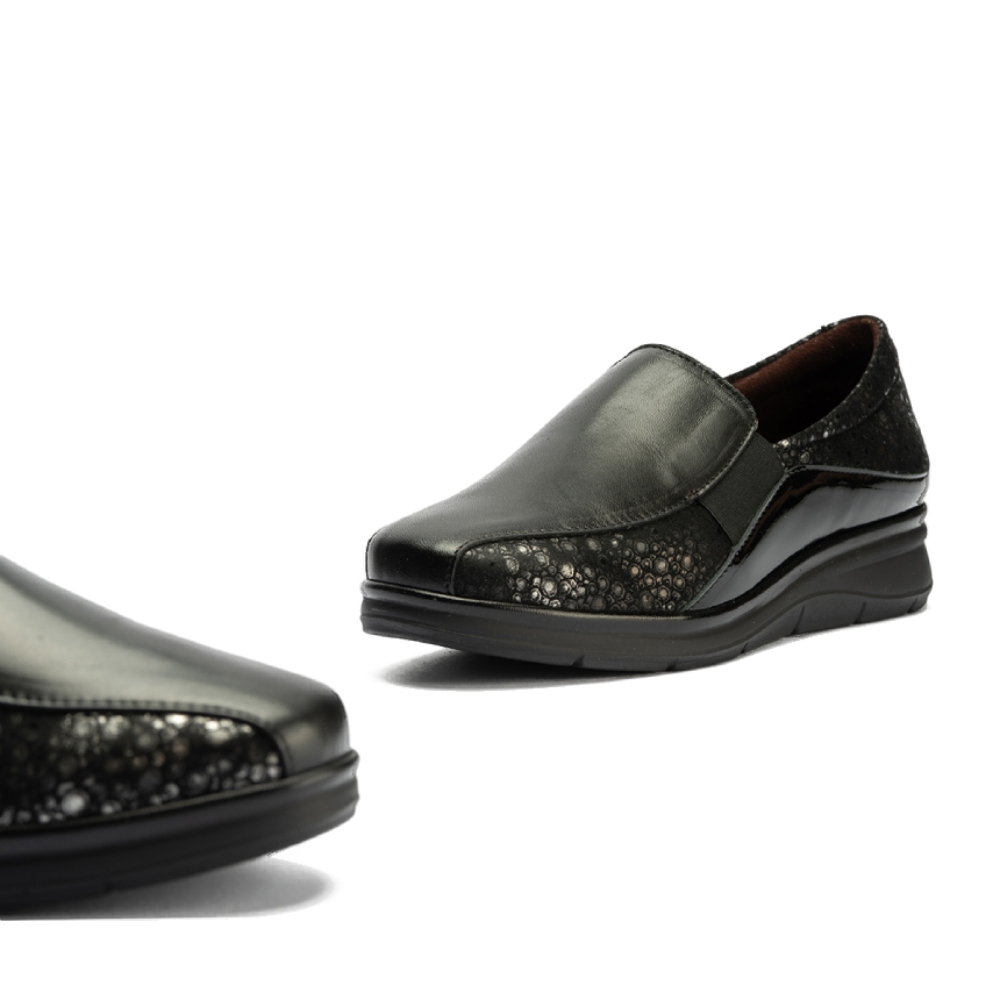 Fabricado con materiales de alta calidad, combina la suavidad de la piel con la flexibilidad de la licra, garantizando que el zapato se adapte a la perfección a la forma de cualquier pie, incluso los más anchos o sensibles. La plantilla es extraíble, lo que te permite usar tu propia plantilla ortopédica si lo necesitas.