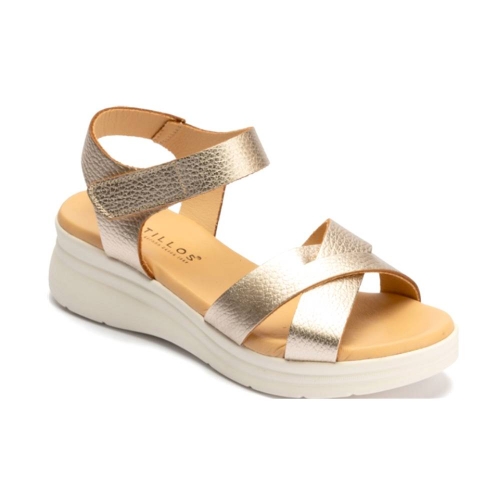 Sandalia de tiras cruzadas piel color oro de pitillos. Con cierre adhesivo. Su pequeña cuña la hace muy cómoda en su pisada. Un diseño y linea de sandalia muy actual , fabricada en piel de primera calidad. Aportará un look muy veraniego para todos tus modelos y para las mejores ocasiones. Un descanso para tus pies.