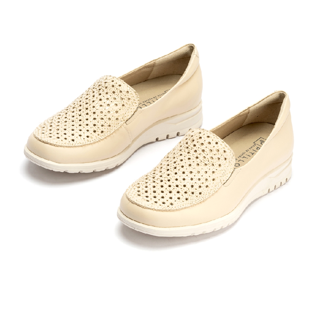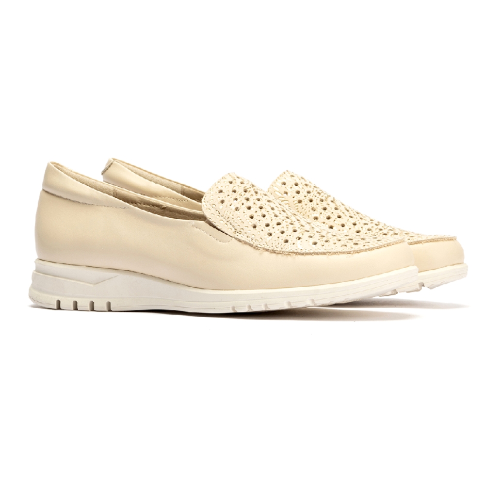 Mocasín elaborado en piel color crema. La piel es suave, por lo que se adapta con facilidad a la forma del pie. Los picados en la pala le aportan un aire más veraniego y fresco. Diseñado con plantilla extraíble Termo conformada y Anti bacterias forrada con Arnedry para una mayor transpiración.