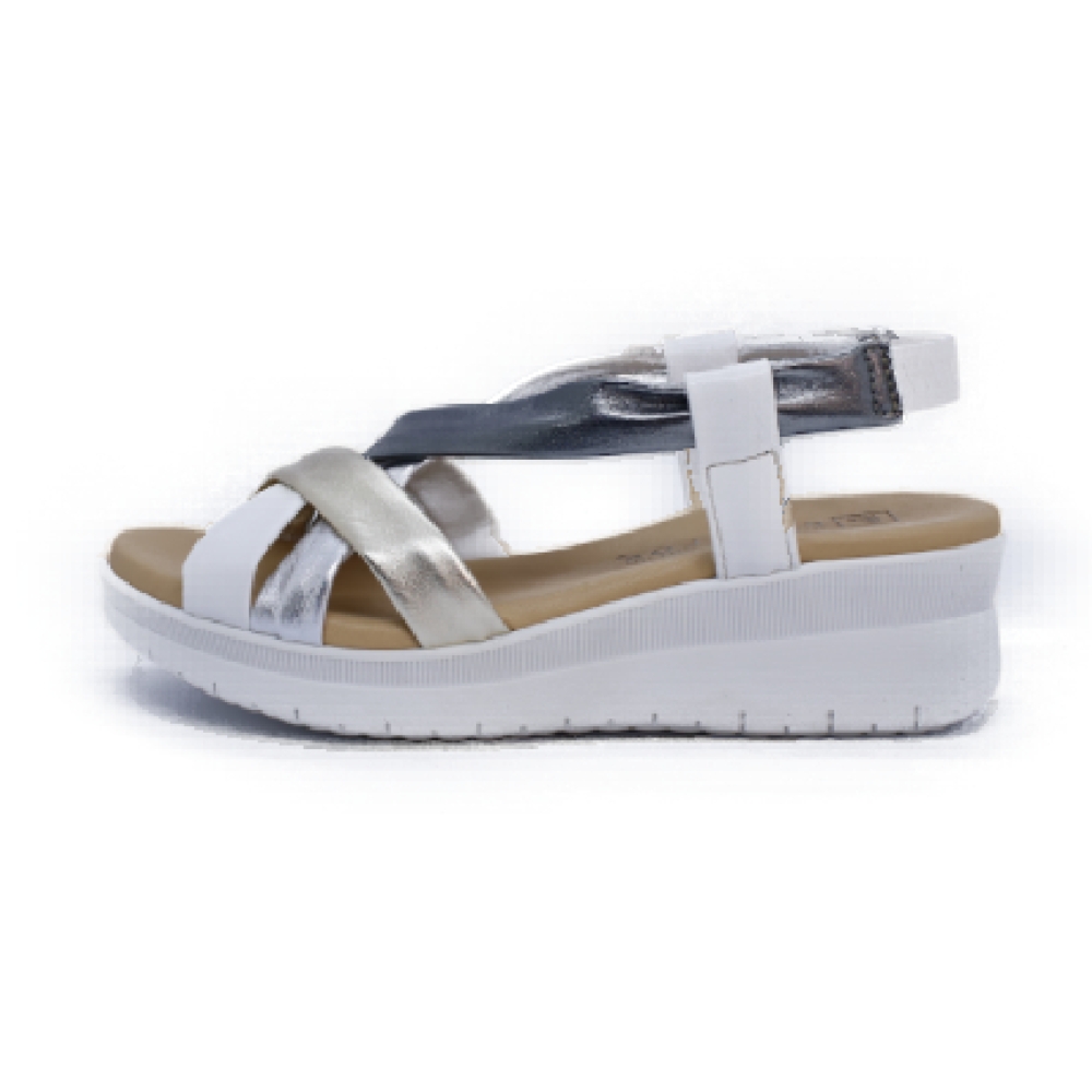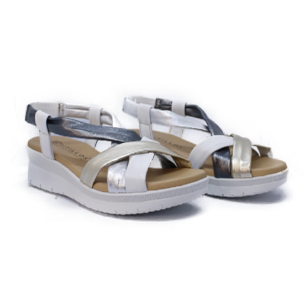 Sandalias de piel con tiras cruzadas tubulares que porporcionan un extra de comodidad. . Cuña de suave pendiente de cuñade  6cm, plataforma 4cm, suela blanca de goma,.  Bonito diseño casual en tonos metalizados, que se va a convertir en tu zapato favorito este verano.