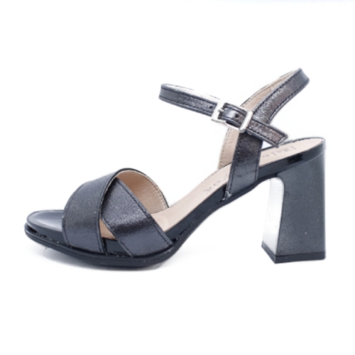 Sandalia de tacón vestir de la marca Pitillos. Fabricada en piel color negro, tejido transpirable en su interior con planta antideslizante. Pala cruzada con buena recogida del pie, hebilla para mejorar la sujeción del empeine. Plataforma delantera para no cargar los metatarsos y tacón brillo cuadrado. Calce normal. Hecho en España.