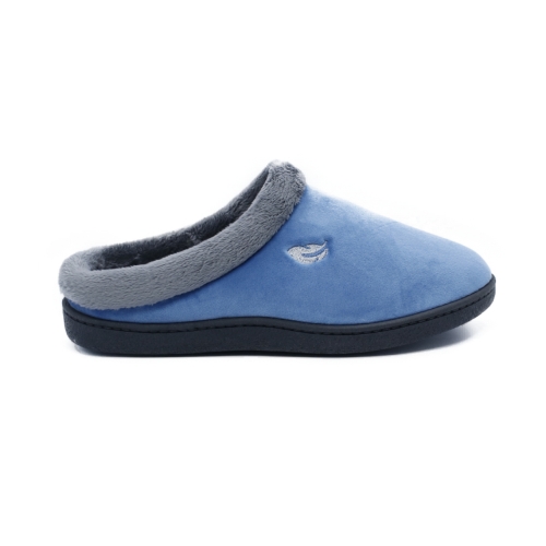 Zapatillas de casa destalonadas,fabricadas en material textil aterciopelado con forro de "pelo". Plantilla extraíble  transpirable de alta recuperación que se adapta a la anatomía del pie, fabricada con tecnología Pluma Flex, que aporta máxima comodidad. Suela de goma flexible y antideslizante. Hecho en España.