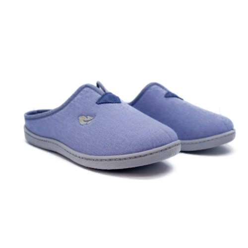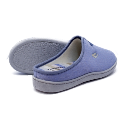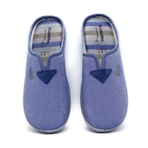Zapatillas de casa Plumaflex para mujer hechas a mano. Fabricadas 100% en España. Diseño en color azul y plantilla con detalles en rayas. Abiertas por el talón. Tejido muy suave al tacto, ideales para la temporada primavera-verano. Plantilla extraíble acolchada Plumaflex que se adapta completamente al pie. Piso de goma que asegura un gran agarre. Muy flexibles y ligeras. Con gran aroma a eucalipto. Tratamiento antibacterias. Se pueden meter en la lavadora