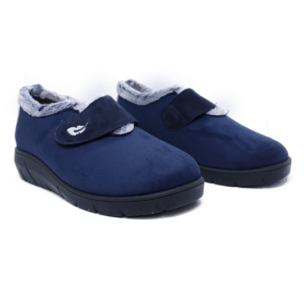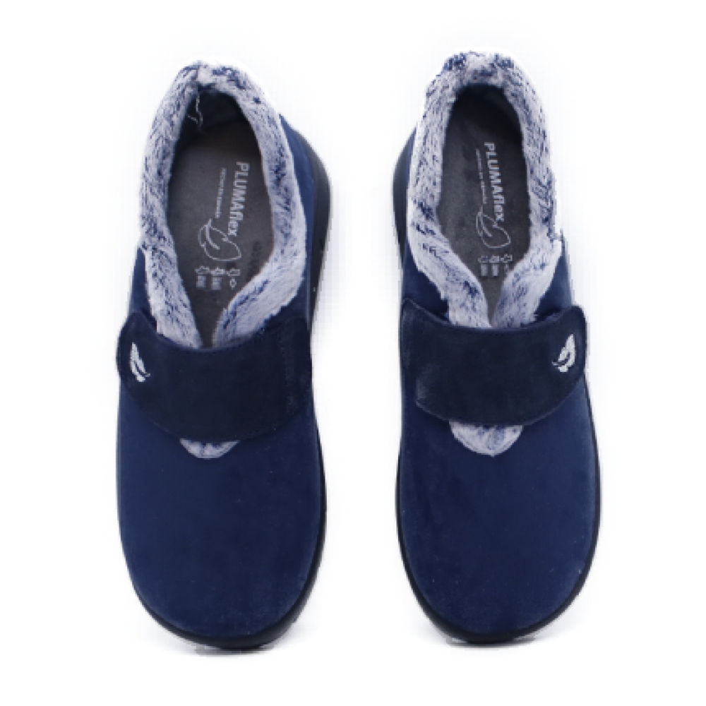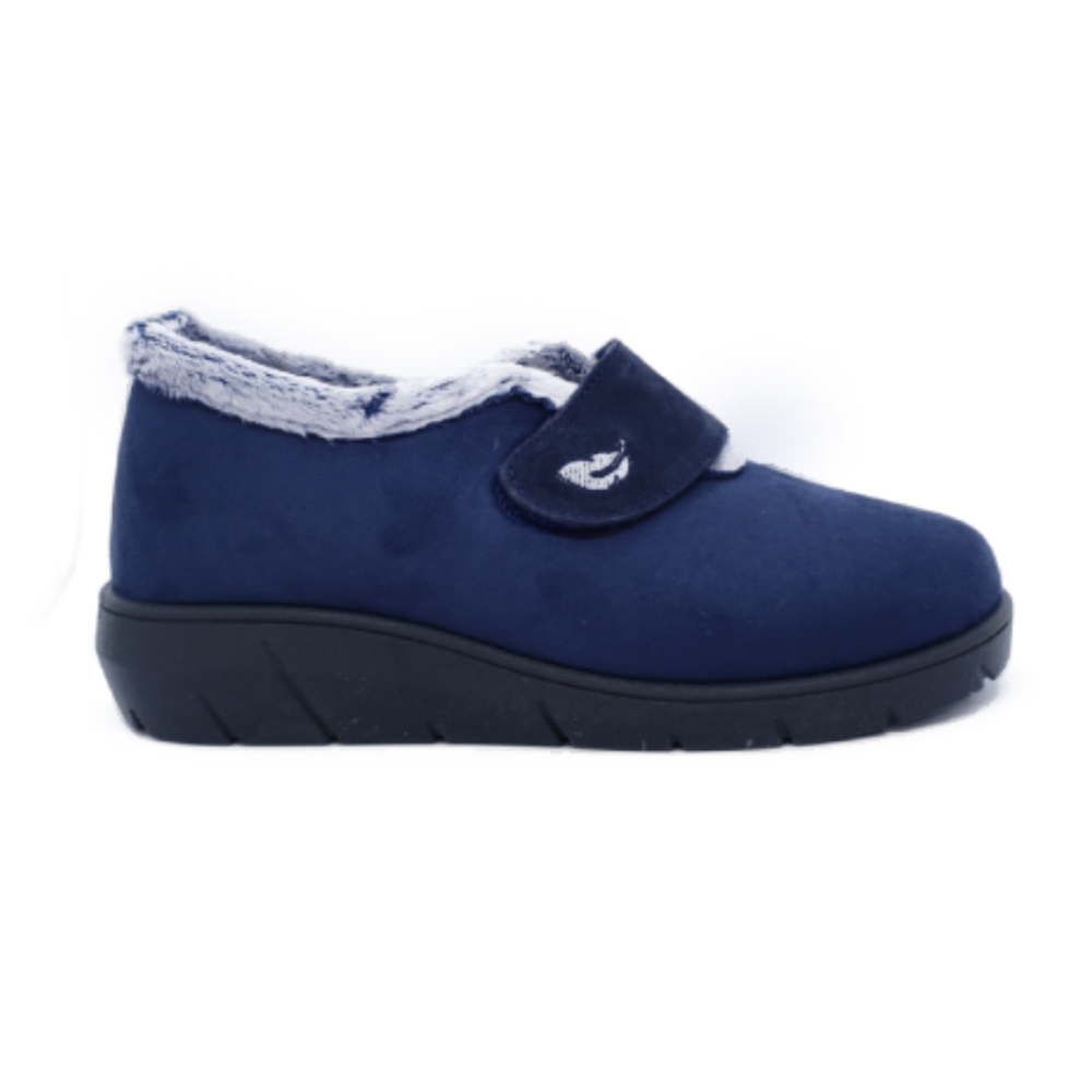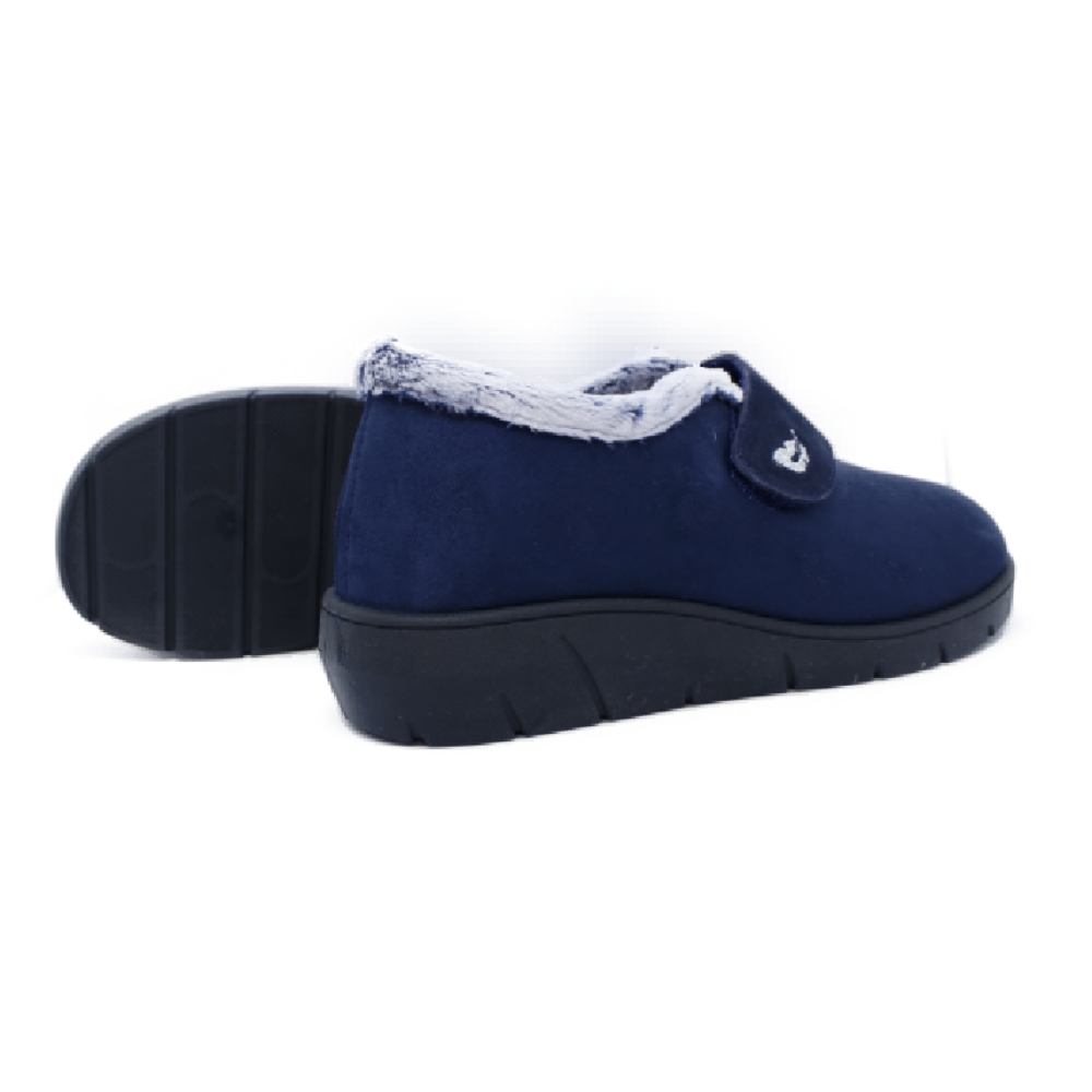 Zapatilla cerrada de andar por casa para mujer, realizada en material textil aterciopelado con ribete de pelo y plantilla extraíble de espuma de PU transpirable de alta recuperación que se adapta completamente a la anatomía del pie. Cierre con velcro para un mayor ajuste al pie. Con aroma de eucalipto y tratamiento anti bacterias.