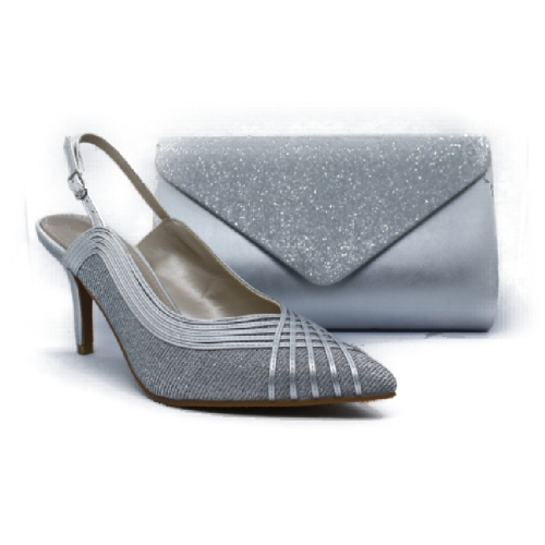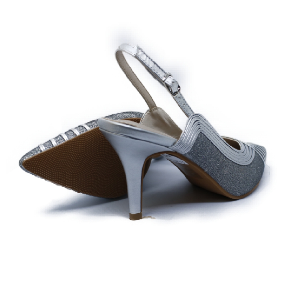 Salón destalonado realizado en material plateado glitter y tiras plateadas cruzadas. Plataforma interna de 1 cm y tacón fino de 7 cm. Un zapato elegante que por su comodidad, se va a convertir en tu favorito para celebraciones. Interior forrado en piel.