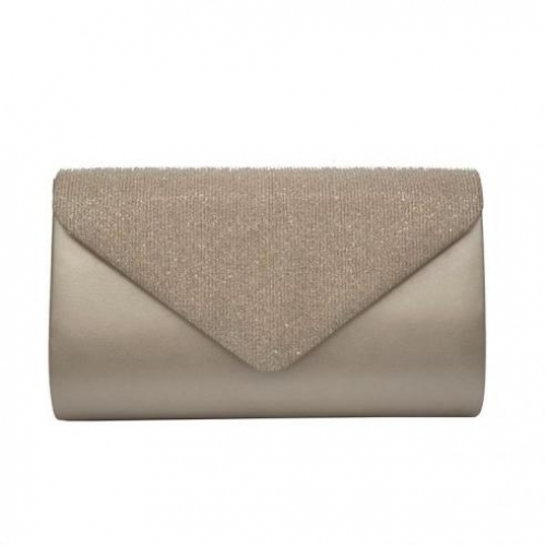 Cartera de vestir en color taupe con solapa redondeada de brillo. Cadena para poder colgar al hombro.