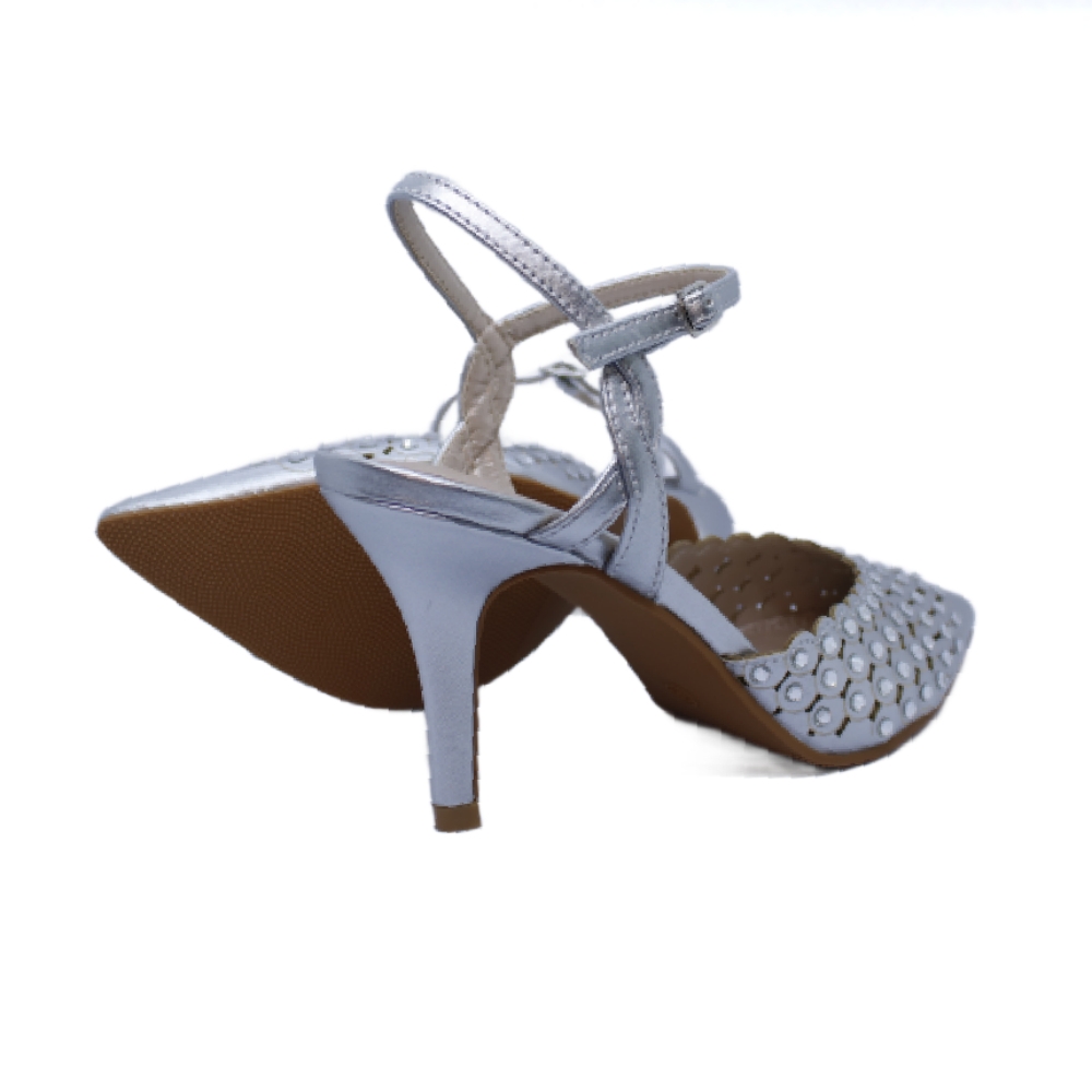 Zapato de salón abierto en el talón, con cierre de hebilla, ideal para eventos y ocasiones especiales. Fabricado en polipiel suave y transpirable en tono plata, con un diseño de fabricación 100% española.