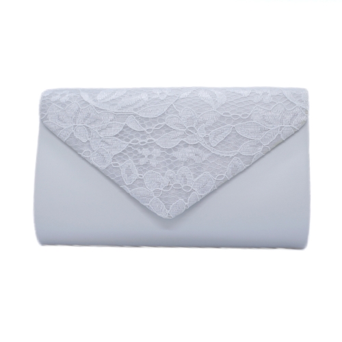 Elegante cartera de fiesta en polipiel con un delicado acabado nacarado en blanco. La solapa presenta un diseño de encaje decorativo al tono, que le aporta un toque de sofisticación. Incluye una cadena interior para llevar al hombro y un práctico cierre de imán para mayor comodidad.