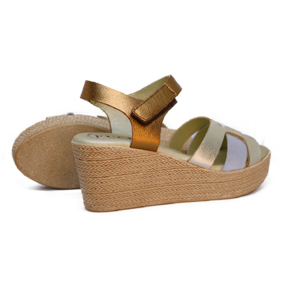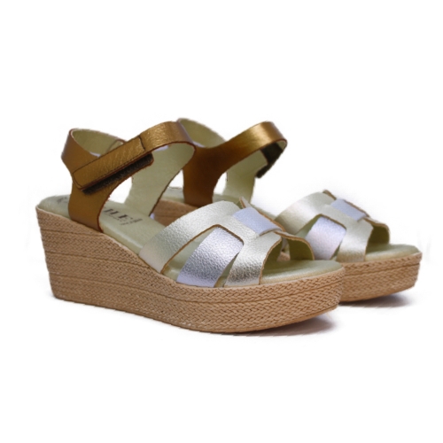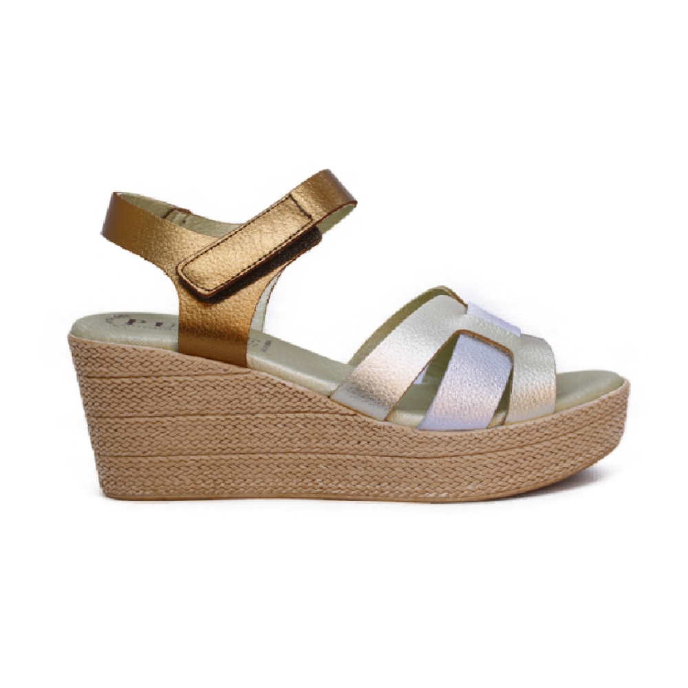 Esta sandalia de la marca Puche es la aliada perfecta para quienes buscan ganar altura sin renunciar a la salud de sus pies. Con un diseño de tiras cruzadas en acabados metalizados (bronce y plata), es un modelo tan versátil que podrás combinarlo tanto con looks de diario como con estilismos más vestidos.