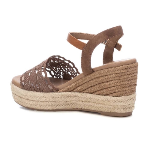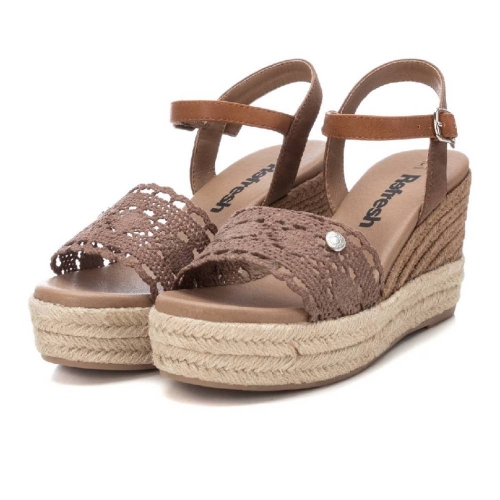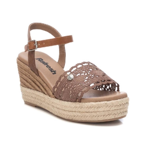Sandalia de mujer, de la marca Refresh. Fabricada en tejido de ganchillo. Cierre mediante correa de material que imita la piel con hebilla. Cómoda cuña de 9 cm de yute con plataforma delantera. Suela de goma antideslizante. Combinalo con tus looks más veraniegos. Este modelo ha obtenido el certificado vegano por la organización mundial PETA (Organización de los derechos de los animales).