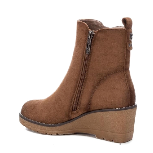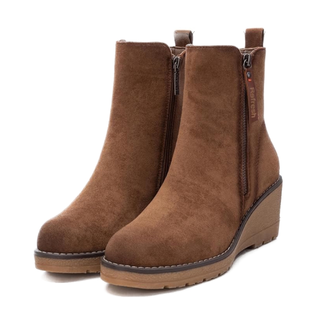 Botín de mujer, de la marca Refresh. Fabricado en antelina. Cierre mediante cremallera lateral. Tirador trasero para facilitar la puesta. Cremallera lateral decorativa. Cómoda cuña de 6 cm con suela de goma antideslizante. Este modelo ha obtenido el certificado vegano por la organización mundial PETA (Organización de los derechos de los animales).