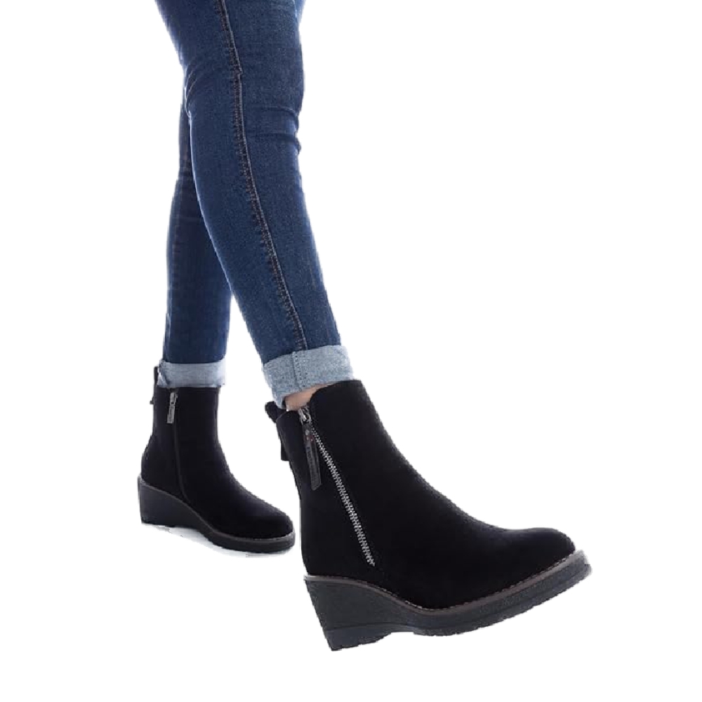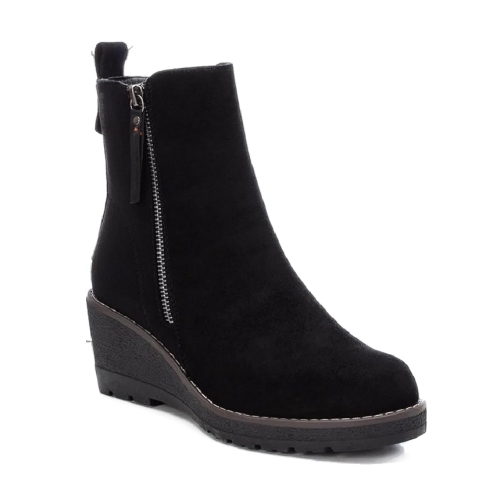 Botín de mujer, de la marca Refresh. Fabricado en antelina. Cierre mediante cremallera lateral. Tirador trasero para facilitar la puesta. Cremallera lateral decorativa. Cómoda cuña de 6 cm con suela de goma antideslizante. Este modelo ha obtenido el certificado vegano por la organización mundial PETA (Organización de los derechos de los animales).