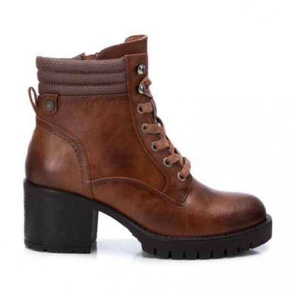 Botín de mujer, de la marca Refresh. Fabricado en material que imita la piel. Cierre mediante cremallera lateral y cordones para un buen ajuste. Botín estilo montañero con collarín textil acolchado. Tacón ancho de 6 cm con suela antideslizante. Este modelo ha obtenido el certificado vegano por la organización mundial PETA (Organización de los derechos de los animales).