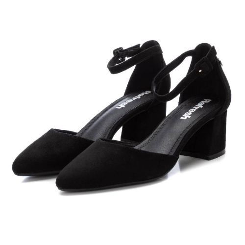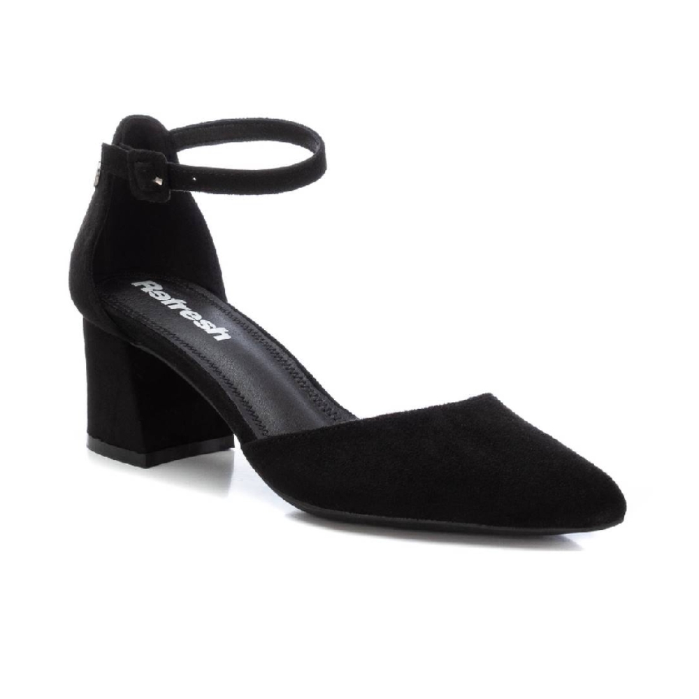 Zapato de mujer, de la marca Refresh. Fabricado en suave antelina. Elegante punta afilada y pulsera al tobillo con cierre de hebilla. Tacón ancho de 6 cm forrado en el mismo material. Suela de goma antideslizante. Este modelo ha obtenido el certificado vegano por la organización mundial PETA (Organización de los derechos de los animales).