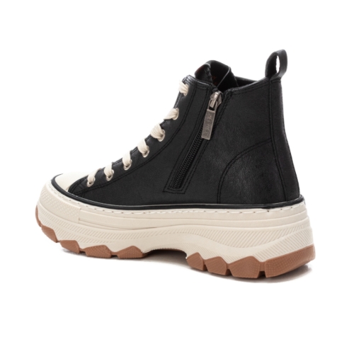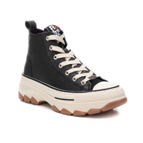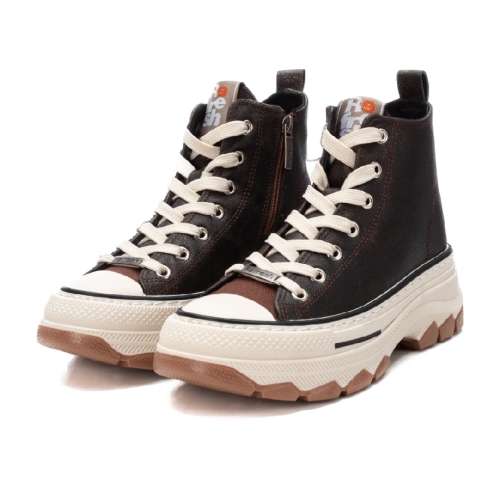 Botín deportivo de mujer, de la marca Refresh. Fabricado en material que imita la piel. Cierre mediante cremallera lateral y cordones ajustables. Suela de goma antideslizante. Este modelo ha obtenido el certificado vegano por la organización mundial PETA (Organización de los derechos de los animales).