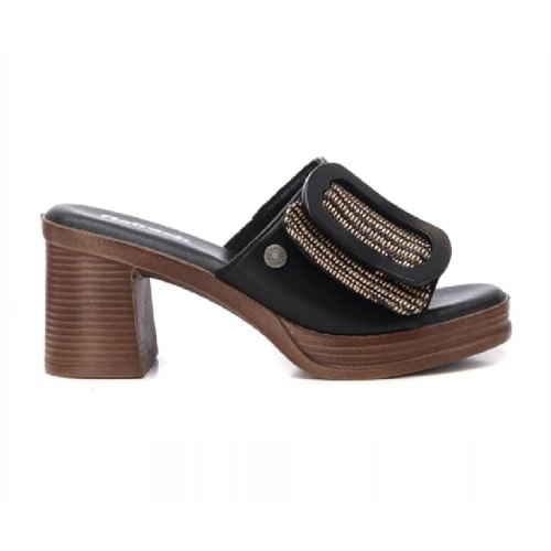 Sandalia marca Refresh. Fabricada en material que imita a la piel combinada con rafia y una gran hebilla en acabado karey. Planta cómoda planta . Sandalia destalonada con tacón de 7 cm efecto madera. Este modelo ha obtenido el certificado vegano por la organización mundial PETA (Organización de los derechos de los animales).