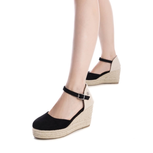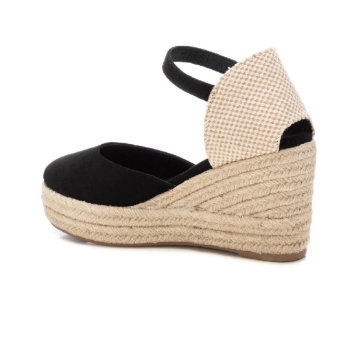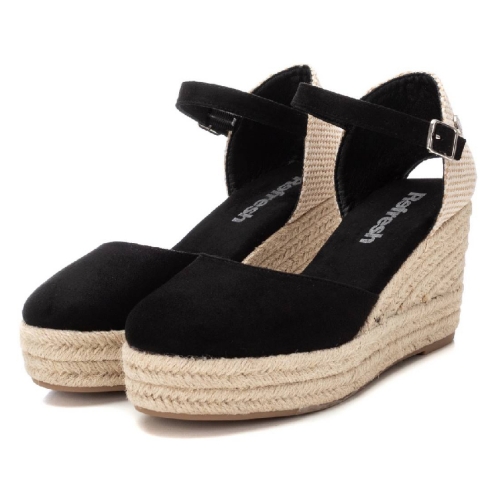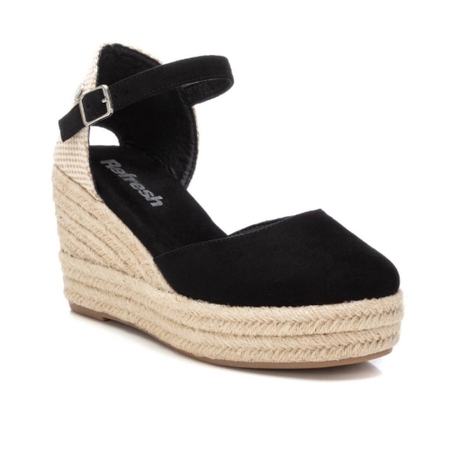 Alpargata de mujer tipo valenciana, de la marca Refresh. Fabricada en material sintético. Correa al tobillo con hebilla. Cuña de 8 cm de yute con suela de goma antideslizante. Una alpargata en color negro en tendencia ideal para esta temporada. Este modelo ha obtenido el certificado vegano por la organización mundial PETA (Organización de los derechos de los animales).
