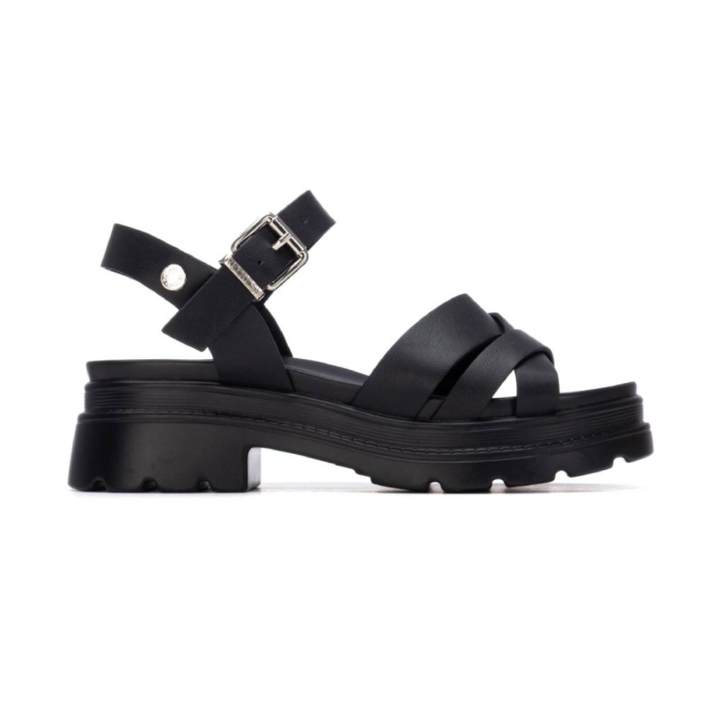 Sandalia de tiras cruzadas de mujer, con cierre de hebilla. Modelo cómodo, fabricado en piel sintética, con suela de goma ligera y antideslizante. Planta acolchada. Color negro. Sandalia con tacón y plataforma de 5 cm. de altura. Certificado vegano.