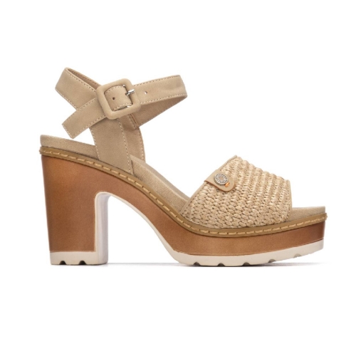 Sandalia de mujer, de la marca Refresh. Fabricada en material textil. Diseño de pala y pulsera con hebilla. Tacón ancho de 10 cm con plataforma delantera y suela antideslizante. Este modelo se convertirá en un imprescindible de armario. Este modelo ha obtenido el certificado vegano por la organización mundial PETA (Organización de los derechos de los animales).