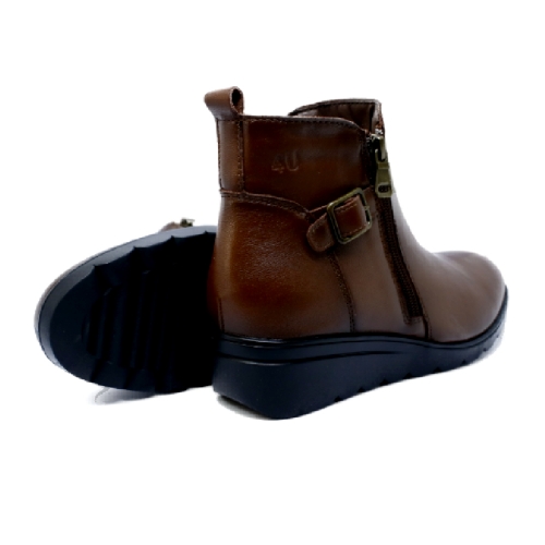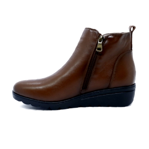 Botín de mujer, con cierre de cremallera lateral. Modelo cómodo fabricado en piel con suela de goma flexible. Detalle de correa. Altura cuña 4 cm. Disponible en color cuero. y negro