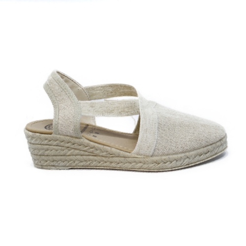 Alpargata de tipo valenciana para mujer, fabricada en lona textil lisa muy suave. Los elásticos unen la talonera a la pala con lo que le proporciona una correcta y elástica sujeción. Planta de material técnico acolchada de gran confort y suavidad. Cuña de imitación yute y suela de goma para mayor agarre.