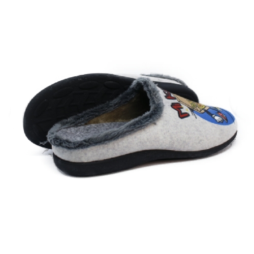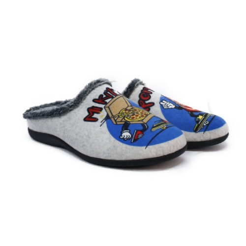 Zapatilla descubierta de  hombre fabricada en tejido suapel muy confortable y cálido. con divertidas imágenes de una "cena light".  Suela de Goma antideslizantes. Apto para lavadora.