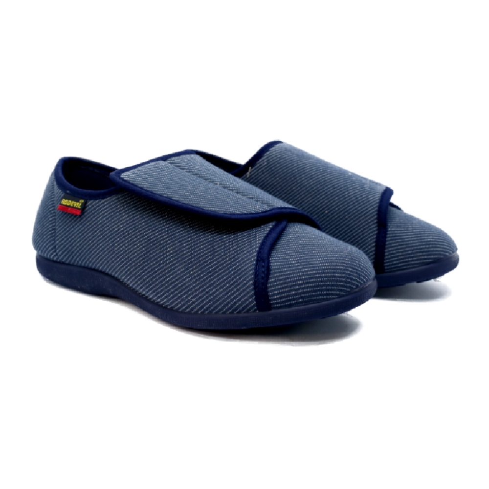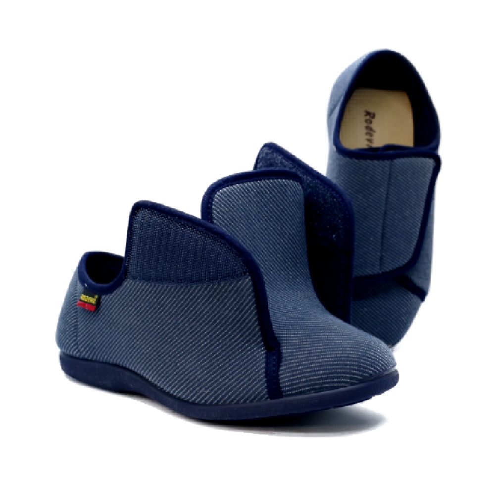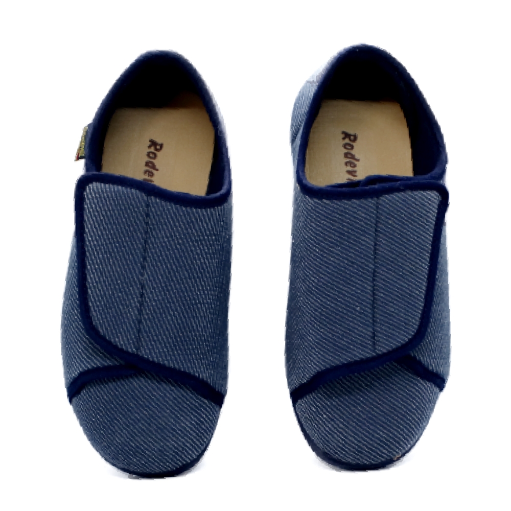 Calzado de uso sanitario fabricado por RODEVIL específicamente diseñado para personas con problemas diversos de funcionalidad en la marcha, que requieren de un ancho especial y un material que les proporcione un mayor confort, diseñado para personas con problemas de calcé en el antepié, que requieren una forma sencilla de calzar gracias a su amplio cierre adherente que se abre hasta la zona de los dedos. Fabricado con un piso antideslizante. Horma Extra Ancha